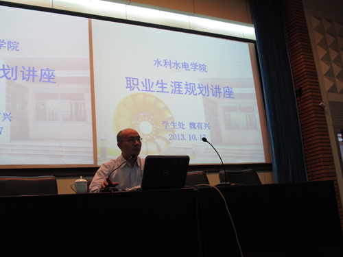 讲座期间,魏处长首先简谈了学生处与同学们日常生活的密切关系,他风趣幽默的语言迅速拉近了与同学们之间的距离。接下来,魏处长总结了大学四年几个关键词,同时鼓励水电院的同学们要多关注我国水利新形势与目前仍存在的问题,做一个将大学专业与职业生涯规划相结合的有心人。最后,魏处长通过一套自测题让同学们了解了一下本身的职业价值观,现场气氛一度达到高潮。