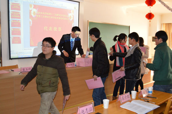 第十二届研究生会代表大会研究生科学技术协会第二次代表大会选举办法》后,研究生会代表9位候选人,研究生科学技术协会4位候选人,按照其姓氏的笔画为序进行讲演,经过无记名投票,宋锦焘等7名同学当选水电院第十二届研究生会委员,钟黎雨等3名同学当选水电院第二届研究生科学技术协会委员。