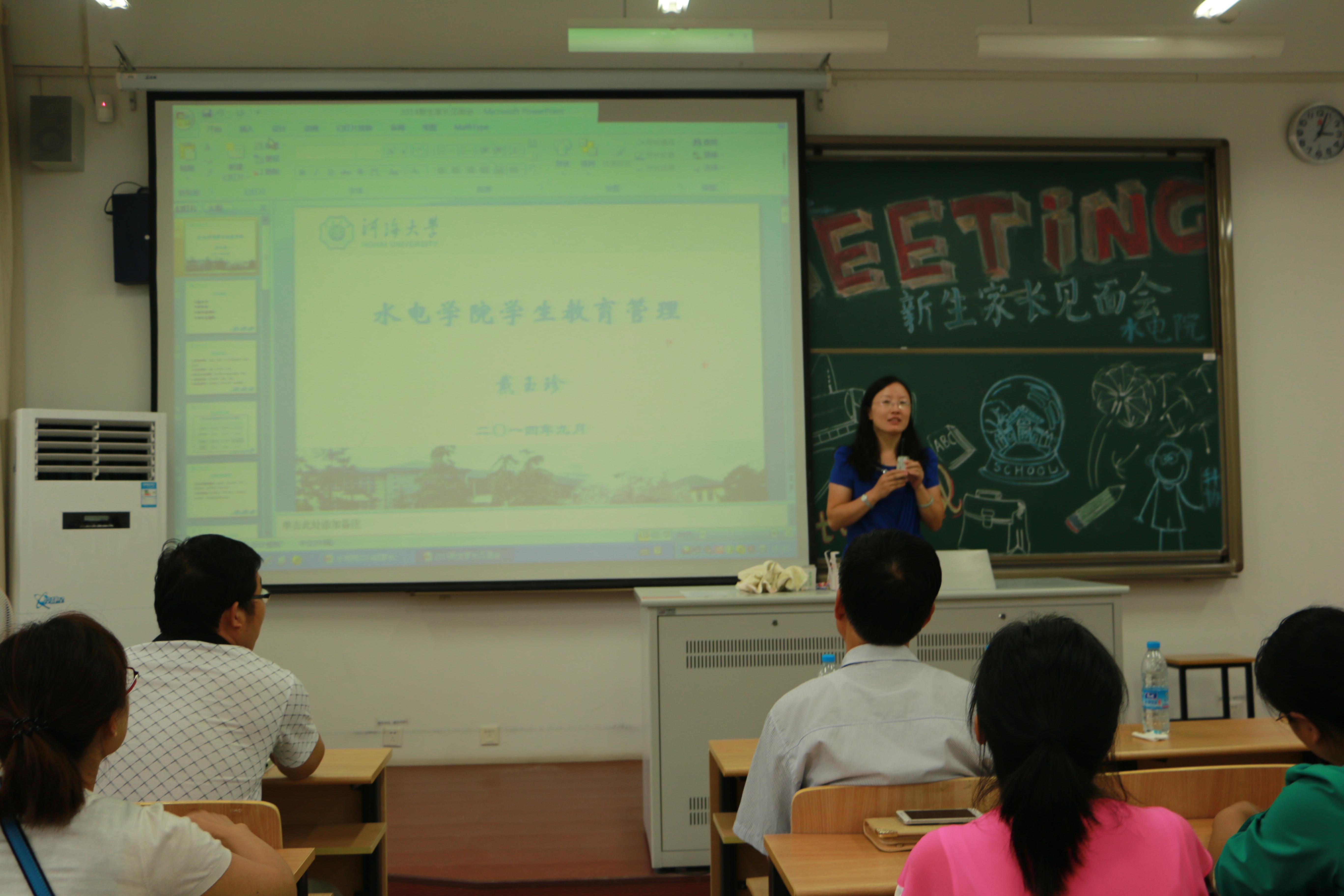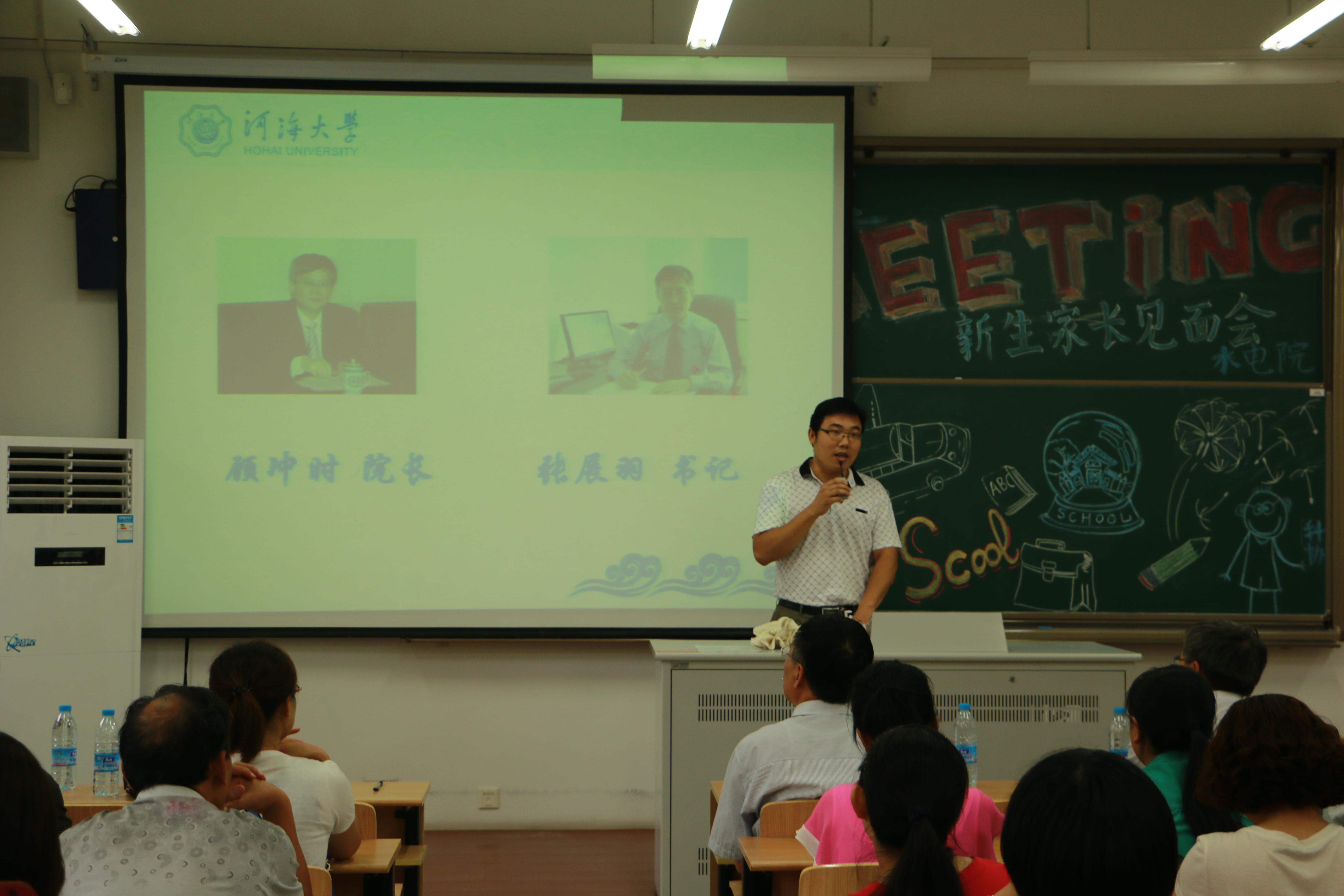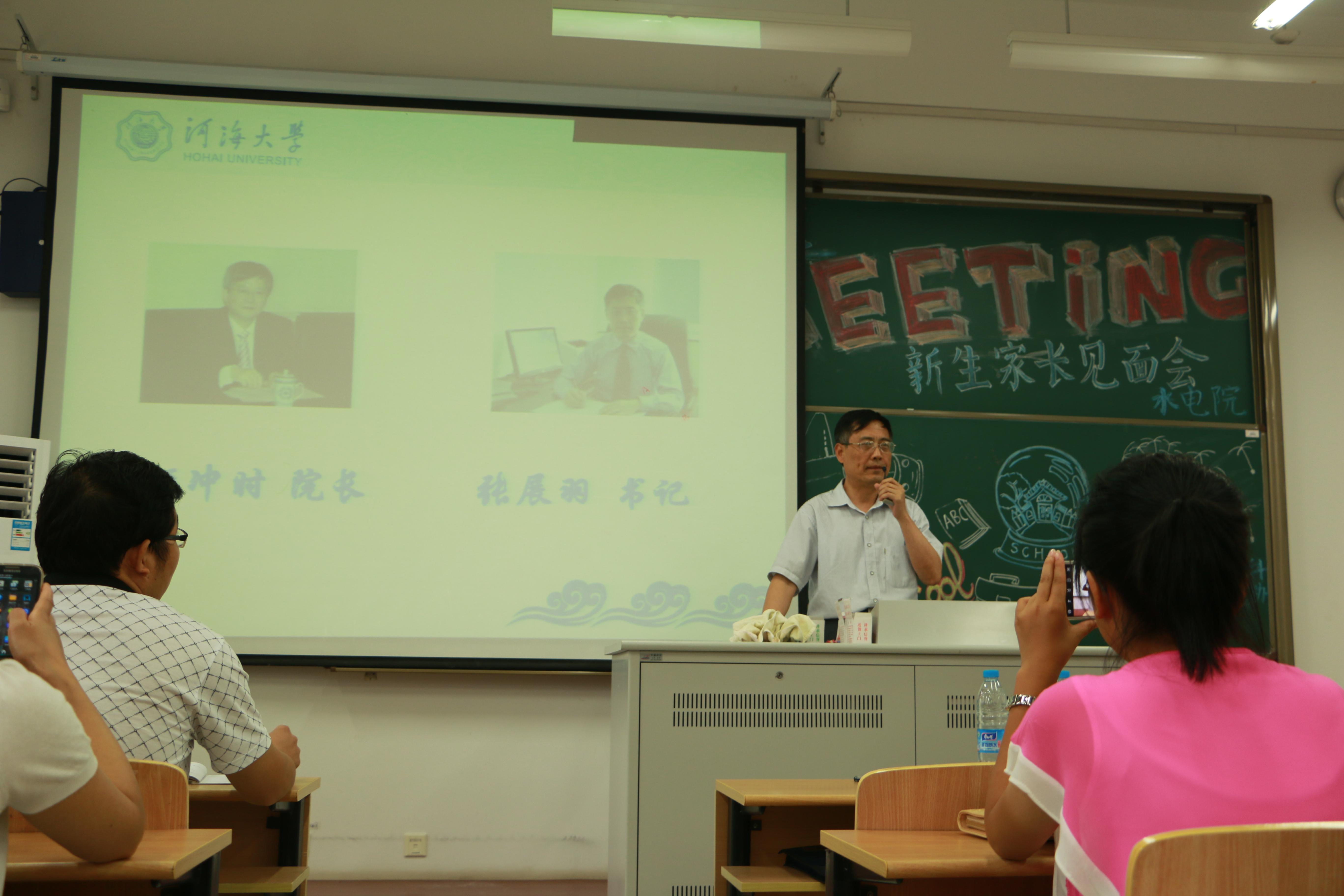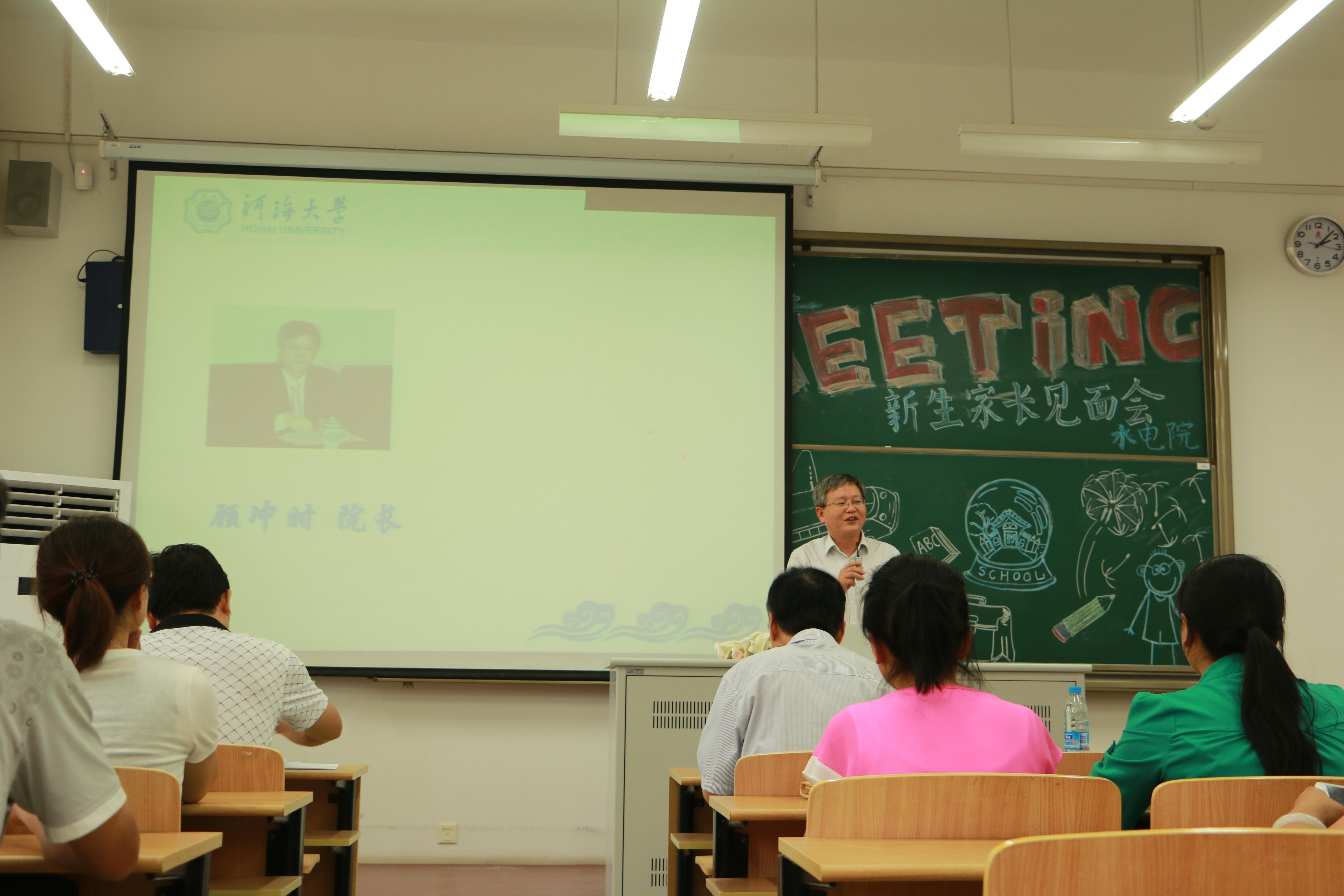 会议伊始,顾院长向家长们介绍了水电院的专业概况和优势、师资力量、学生文体活动、培养目标和就业情况,全面展现了学院雄厚的办学实力、广泛的学术影响、良好的社会声誉、完善的培养体系、优异的人才培养质量。同时,顾院长对2014级新生家长提出了几点建议,包括学生学习方法,同学关系处理,人格培养,考风考纪等。