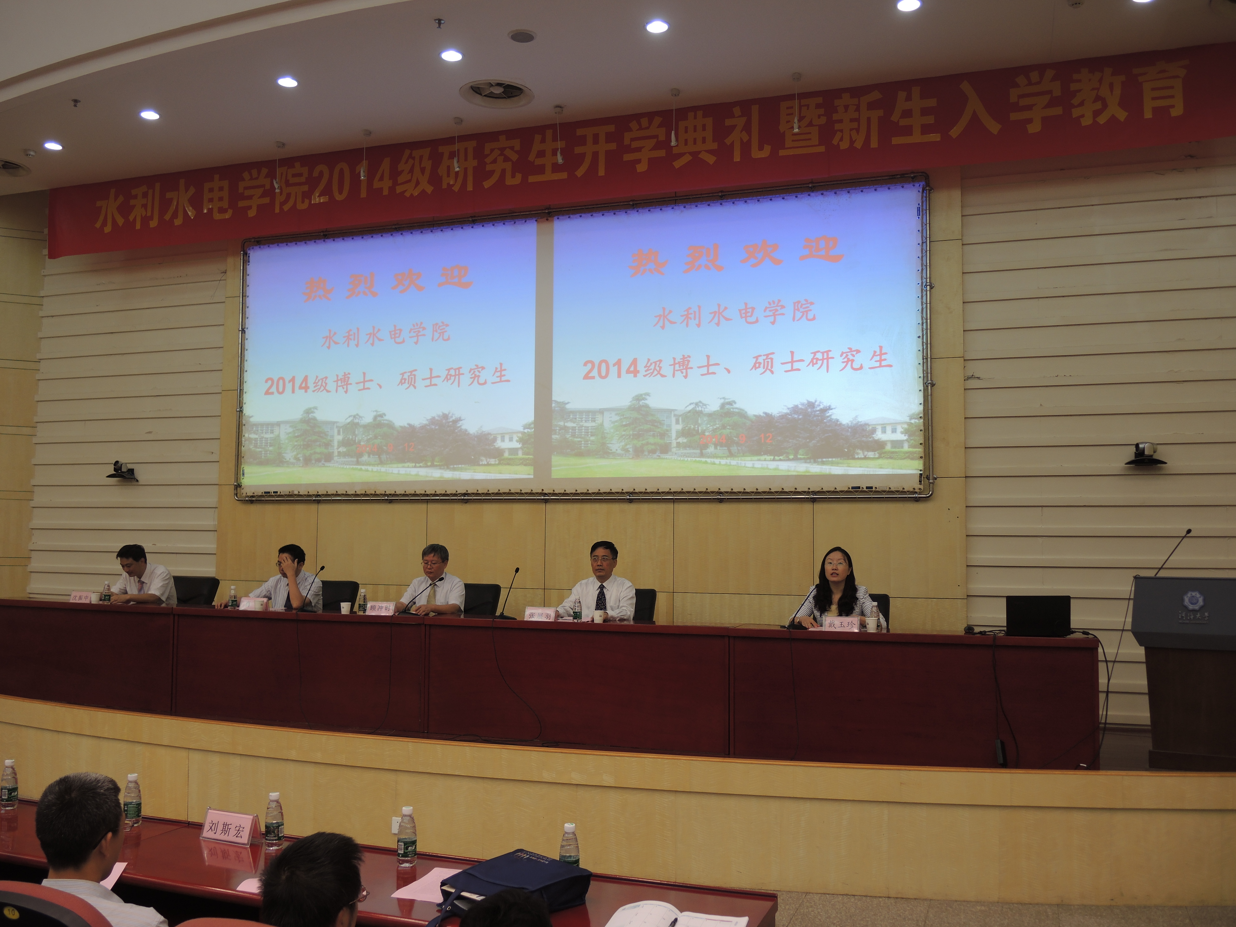 2014年9月12日上午8:30,成人抖音 在闻天馆108隆重举行2014级博士、硕士研究生开学典礼暨新生入学教育。成人抖音 院长顾冲时教授,党委书记张展羽教授,副院长肖洋教授、沈振中教授,及水利水电工程系主任蔡付林教授,农业水利工程系主任朱成立副教授,水工结构研究所副所长苏怀智教授,水电研究所副所长周建旭教授,水力学及河流动力学研究所副所长杨校礼老师,农业水土工程研究所所长郭相平教授,农业环境研究所所长邵孝侯教授等出席了典礼,典礼由成人抖音 党委副书记戴玉珍老师主持。参加典礼的还有成人抖音 研究生教学秘书周昶老师、研究生辅导员赵志涵老师以及辅导员助管慕子煜老师。