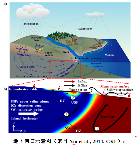 国际学术界基本达成共识,地下河口是和地表河口同样重要的海水–淡水混合区,是陆源污染物入海的另一个重要通道。通过地下河口的海底地下水排泄(Submarine groundwater discharge/SGD)对近海的化学物质平衡及水环境有重要影响。