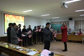 2:00主持人宣布联欢会开始并邀请学院书记陈毓陵致辞。第一个节目学院两办的年轻人给大家的河海校歌,边歌边舞让人耳目一新,接着是水工结构研究所的合唱“打靶归来”,一首简单的老歌,唱出了另样的风格,还有水利水电研究所的合唱“康定情歌”,水力学及泥沙研究所的合唱“我和我的祖国”,老师孩子们的舞蹈,孩童的纯真,给人从内心的喜悦。联欢会穿插了十九大报告的知识竞猜,大家踊跃答题,说明大家对十九大报告的内容熟悉了解。你说我猜的小游戏,出场的夫妻组合、院长组合配合都十分默契,都在规定的时间猜对了词语,让人捧腹欢笑。联欢会在清脆的童声独唱和办公室主任的男生独唱中结束。
