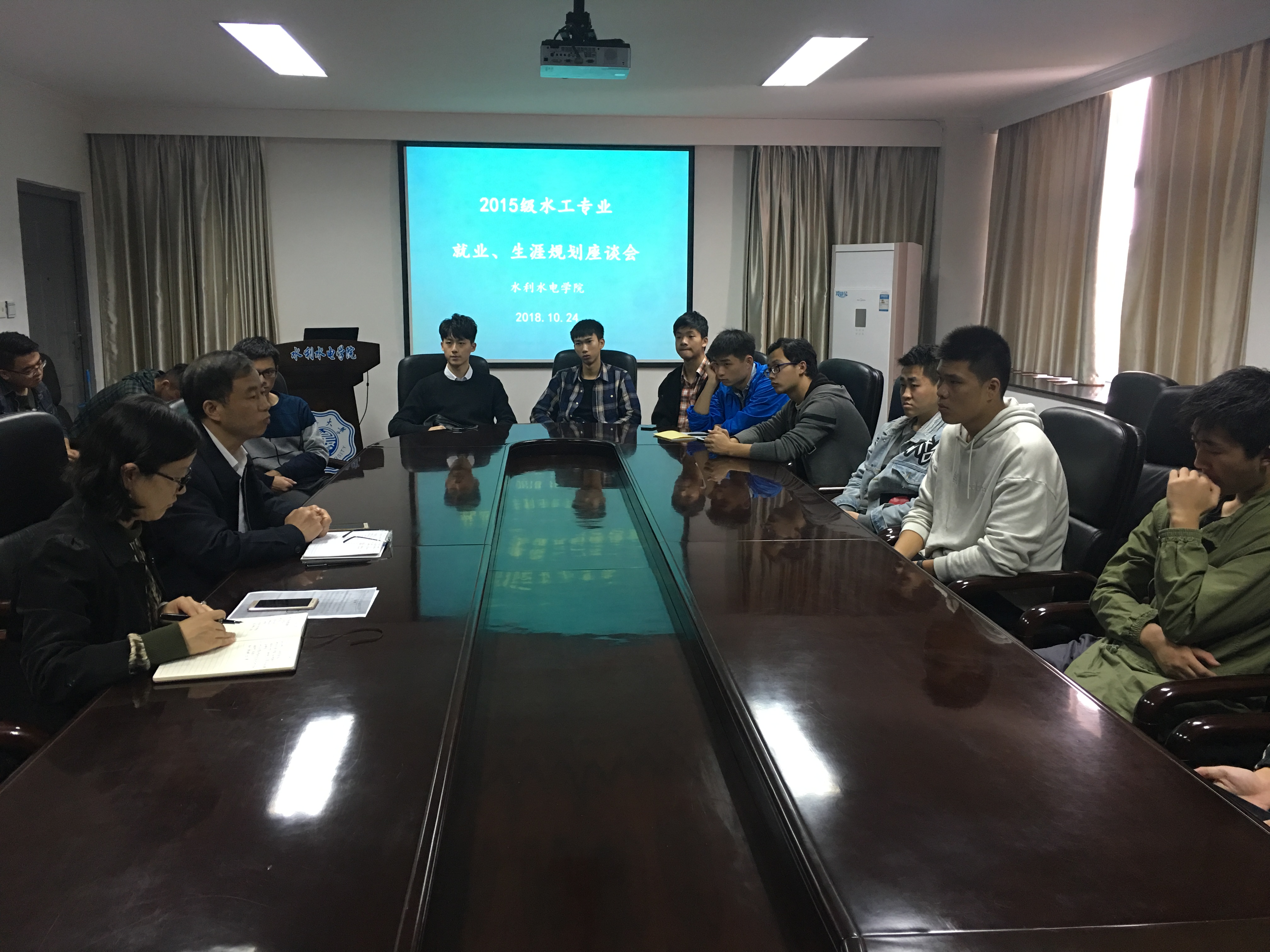 10月24日,成人抖音 举行2015级水工专业就业、生涯规划座谈会。会议邀请院党委戴玉珍副书记、水利水电工程系主任蔡付林教授参加,2015级辅导员笪步源和水工专业学生代表共同参与座谈。