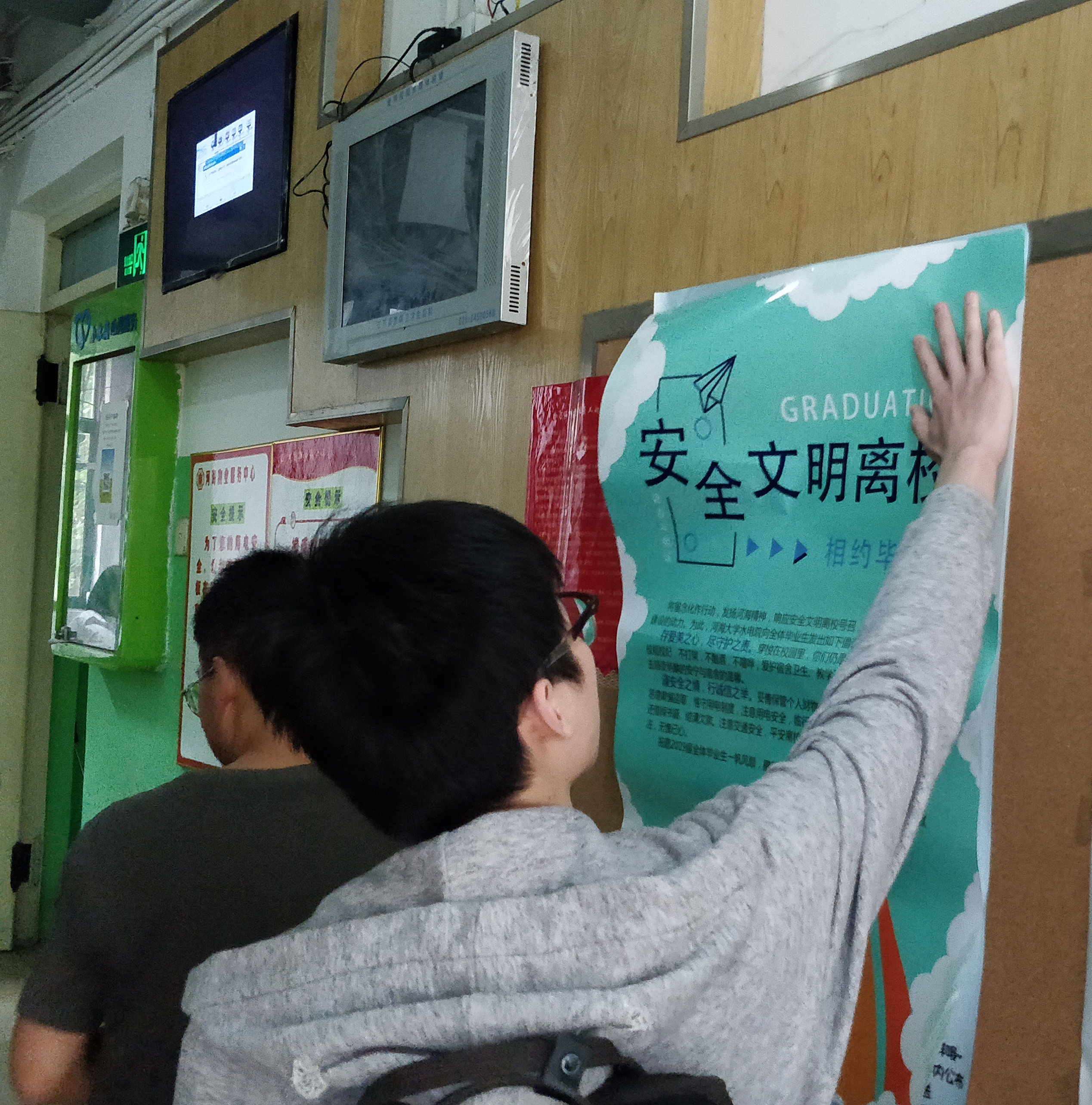 2019年6月,成人抖音 开展了毕业生“安全离校”活动。本次的活动分两个部分展开:第一,在各毕业生宿舍楼道张贴主题宣传海报,向毕业生们传播安全离校理念;第二,在一食堂门口开展“感恩母校无私培育情,倡导安全离校风”的签名活动,组织路过毕业生们在横幅上签名纪念。大家响应积极,并深情感谢母校的三年栽培。