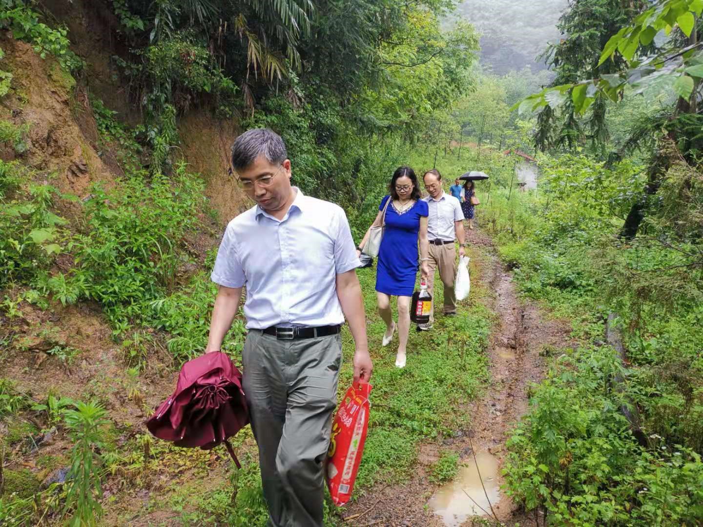 山路崎岖,几位党员老师手提米面粮油,步行走入几户特困家庭,送上生活必需品的同时问候老人的生活情况、身体情况。并从精神上鼓励老人要在国家好政策的扶持下健康快乐生活,支部教师表示会在他们返回学校之后,动员支部教师党员力量为老人们捐资捐物,更好的保障他们晚年生活。