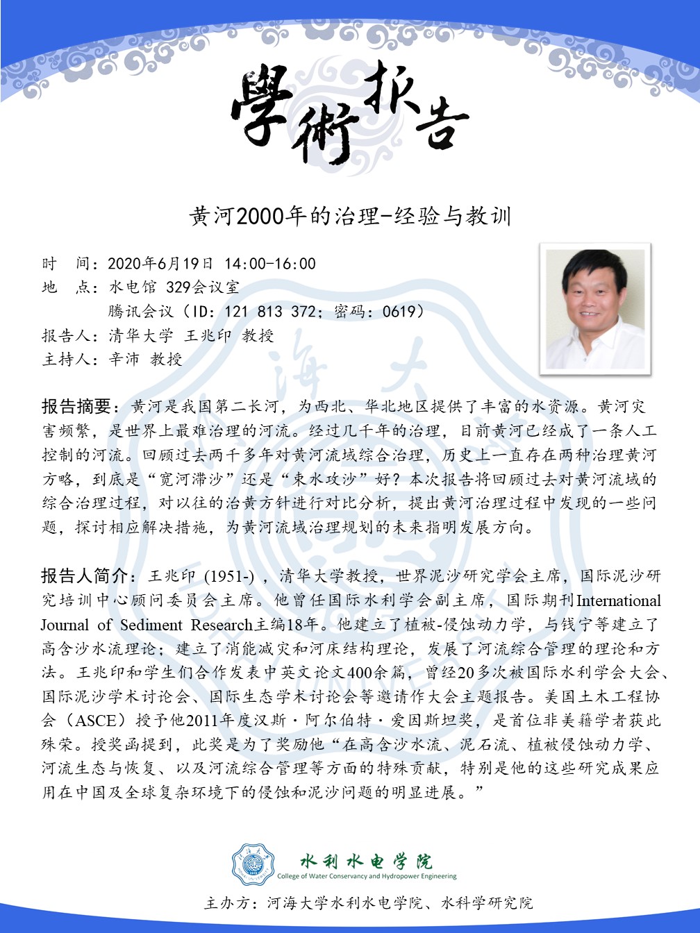 王兆印(1951-) ,清华大学教授,世界泥沙研究学会主席,国际泥沙研究培训中心顾问委员会主席。他曾任国际水利学会副主席,国际期刊International Journal of Sediment Research主编18年。他建立了植被-侵蚀动力学,与钱宁等建立了高含沙水流理论;建立了消能减灾和河床结构理论,发展了河流综合管理的理论和方法。王兆印和学生们合作发表中英文论文400余篇,曾经20多次被国际水利学会大会、国际泥沙学术讨论会、国际生态学术讨论会等邀请作大会主题报告。美国土木工程协会(ASCE)授予他2011年度汉斯・阿尔伯特・爱因斯坦奖,是首位非美籍学者获此殊荣。授奖函提到,此奖是为了奖励他“在高含沙水流、泥石流、植被侵蚀动力学、河流生态与恢复、以及河流综合管理等方面的特殊贡献,特别是他的这些研究成果应用在中国及全球复杂环境下的侵蚀和泥沙问题的明显进展。”