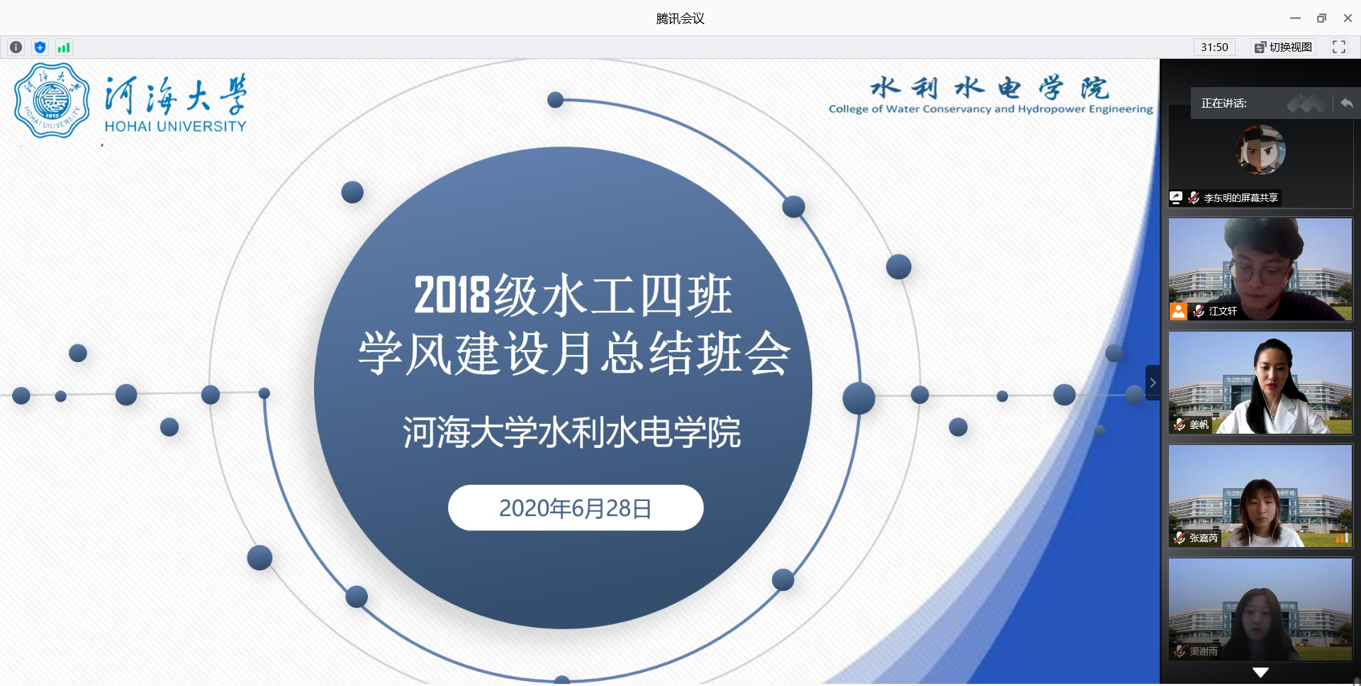 根据学校开展领导干部结对联系学生工作的相关要求和学院整体安排,6月28日下午,水电院2018级水工四班举办“隔空不隔爱,停课不停学”学风建设线上主题班会。成人抖音 副校长郑金海、水电院党委副书记王方、2018级水工四班全体同学参加班会。2018级本科生辅导员姜帆主持班会。