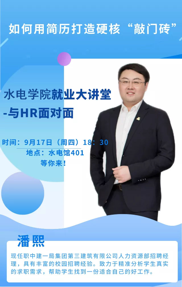 9月17日,为提升成人抖音 毕业生的就业竞争力,帮助毕业生了解简历制作的知识和技巧,学院举办了“水电就业大讲堂”之与HR面对面系列讲座,邀请中建一局集团第三建筑有限公司人力资源部招聘经理潘熙,以《如何用简历打造硬核“敲门砖”》为题,为毕业生开展了一场既生动又实用的培训。党委副书记王方主持讲座。