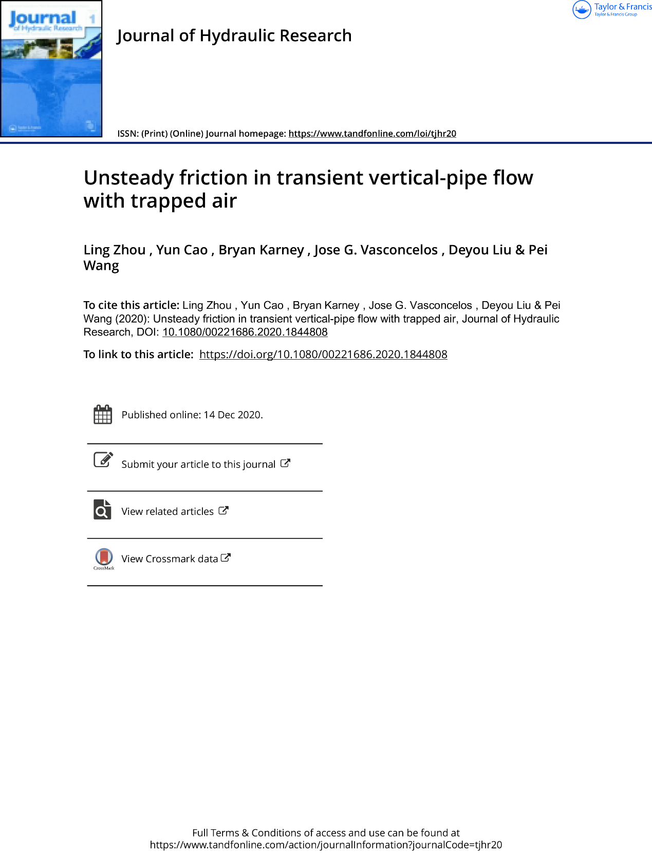 周领教授、曹云博士生、加拿大多伦多大学Bryan Karney教授、美国奥本大学Jose G. Vasconcelos教授、刘德有教授等合作完成的论文“Unsteady friction in transient vertical-pipe flow with trapped air”发表在水力学领域享有盛誉的国际顶尖期刊《Journal of Hydraulic Research-IAHR》上(//doi.org/10.1080/00221686.2020.1844808)。研究工作得到国家自然科学基金(51679066、51839008)、霍英东教育基金(161068)等资助。