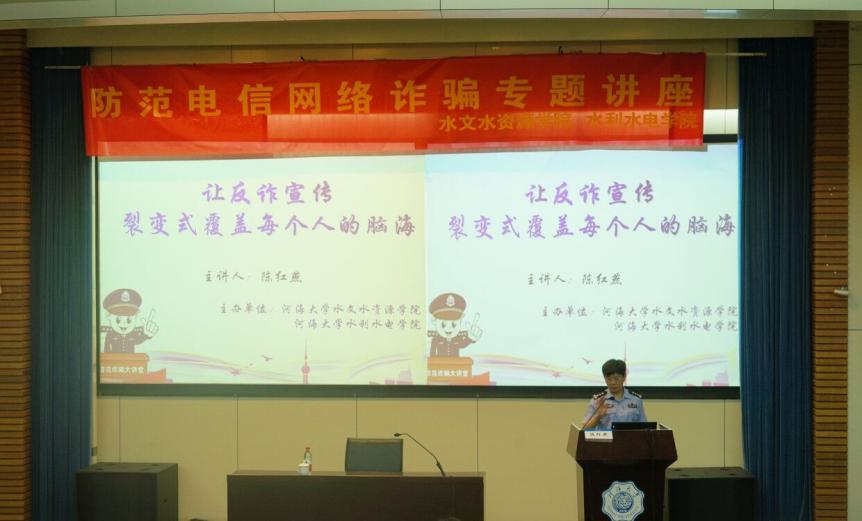 为了提高广大师生识别和防范电信诈骗的能力,使防范电信网络诈骗知识更好地入耳、入脑、入心,2021年5月13日晚,成人抖音 与水文院联合南京市公安局刑侦局反诈中心,邀请四级高级警长陈红燕开展了大学生防范电信诈骗知识专题讲座。讲座由成人抖音 保卫处副处长吴青山主持,水电院2019级辅导员帅雨婷、水文院2019级辅导员许文傧出席,两院学生参加。