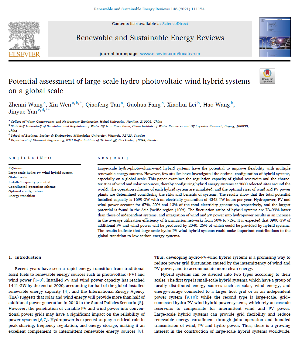 近日,成人抖音 2018级水利水电工程专业博士研究生王珍妮在风光水多能互补研究领域取得重要科研进展,以第一作者身份在能源领域顶级期刊Renewable and Sustainable Energy Reviews(一区Top,2020年影响因子14.98)上发表了题为《Potential assessment of large-scale hydro-photovoltaic-wind hybrid systems on a global scale》的学术论文。成人抖音 闻昕青年教授和欧洲科学与艺术院院士、瑞典皇家理工学院和梅拉达伦大学严晋跃教授为论文共同通讯作者。