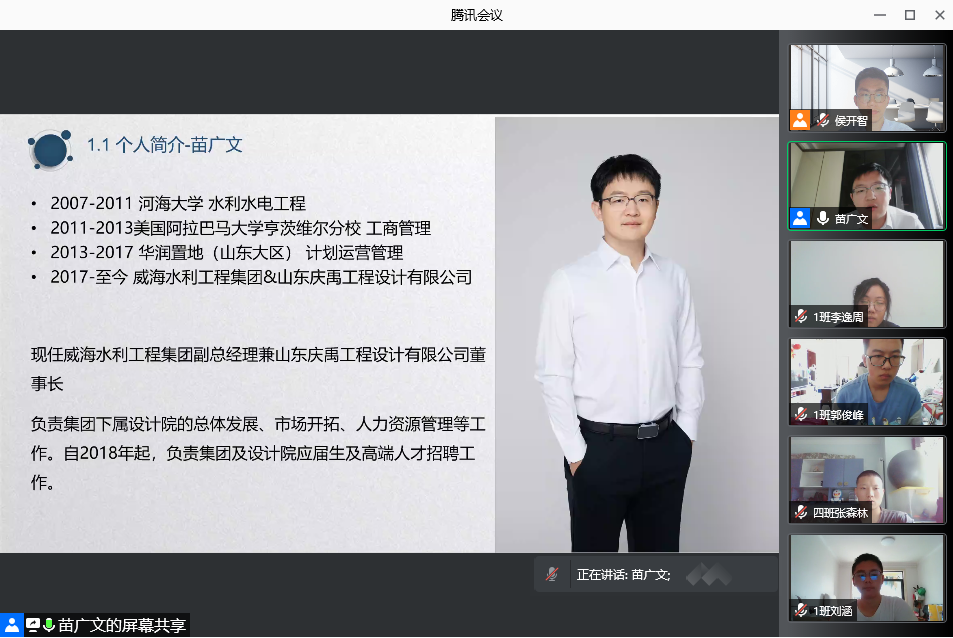 12日下午,2021级扬帆·大学生涯起航周活动之“传承·我的大学”线上交流分享会顺利举行,2021级全体同学、辅导员侯开智参加分享会,院党委副书记王方主持会议。分享会邀请浙江省水利发展规划研究中心刘志伟,华东勘测设计研究院有限公司履约支持中心-能源电力与水利室主任于良,威海水利工程集团副总经理兼山东庆禹工程设计有限公司董事长苗广文,中国能建集团葛洲坝国际工程有限公司国别经理狄文龙,清华大学水利水电工程系博士生曹园,五位优秀校友分享他们在成人抖音 就读时的精彩大学生活,并结合各自的经历,从不同角度给学弟学妹分享宝贵经验。