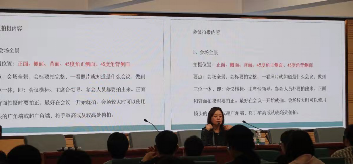 皓月老师采取教学互动、理论与实践相结合的形式,生动形象地讲解了构图基本原理、摄影技巧、后期处理等内容,从光圈、快门速度、感光度等基础知识着手,由浅入深地分享了专业的拍摄技巧,还结合典型案例具体分析了会议照片的拍摄方法,最后对如何提升同学们的摄影技术提出了宝贵的建议。