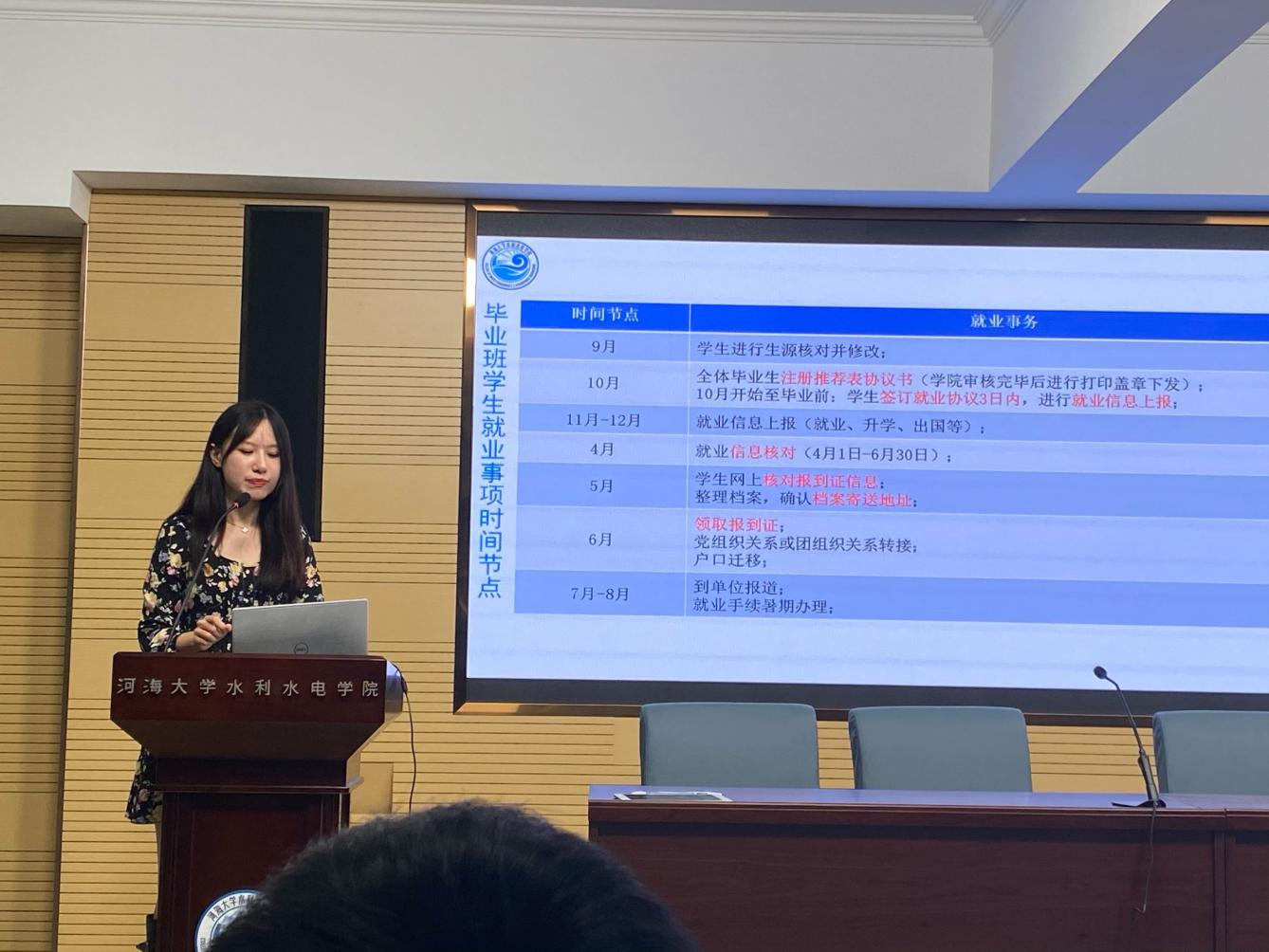 在前期开展“梦想助飞计划”的基础上,针对毕业后有就业意向的同学,学院开展第四次职业生涯规划及就业指导。针对就业形势、学校就业政策、就业推荐表的填写及签订就业协议过程中的注意事项开展详细解读,提高了同学们对就业工作的重视程度。她提出三点要求:一是把握时机,主动出击。秋招是就业的黄金阶段,应当把握好机会,提升自身求职技巧和职场竞争能力,在做好简历的基础上,主动参加各类招聘会,积极投递简历。二是转变观念,立足实际。要在适合本专业的职业范围内最大可能地发挥自身所长,找准未来的就业方向,将自己专业所长投身到水利事业发展中去,将个人事业发展与国家命运发展相联系。三是保持前瞻,提升水平。毕业生应勇于到基层锻炼成长,善于在艰苦、复杂的环境中脱颖而出,认清就业形势,处理好理想和现实的关系,合理调整就业期待。