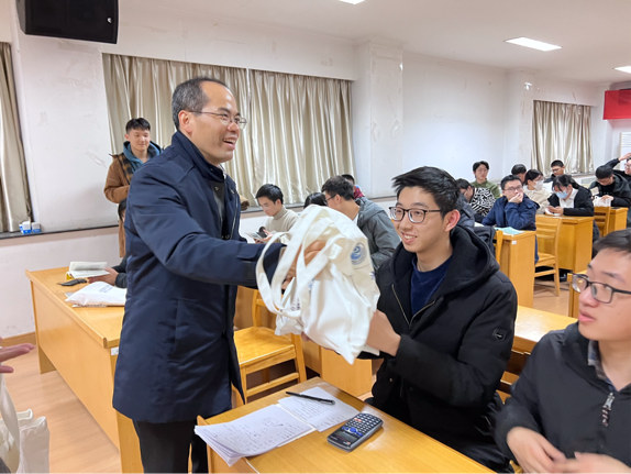 郑金海校长为考生们送上诚挚祝福。他充分肯定了学院为考研学子提供复习教室和备考支持的办实事举措,高度认可学院整体考研氛围和考生学习状态。他亲切地叮嘱同学们在最后冲刺阶段要保持良好的精神状态和身体健康,鼓励同学们要坚定信心,沉着应对,以饱满的状态迎接考试,力争考出好成绩。郑校长及学院领导为考研学子送上考研加油礼包,现场气氛热烈,师生融洽一堂。