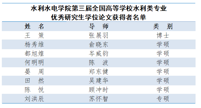 日前,中国水利教育协会公布了第三届全国高等学校水利类专业优秀研究生学位论文评选结果。经协会初审、通讯评审和专家会评,评出第三届全国高等学校水利类专业优秀研究生学位论文。其中,博士学位论文10篇、学术型硕士学位论文30篇、专业硕士学位论文20篇。成人抖音 王策等8名研究生的学位论文获此殊荣。