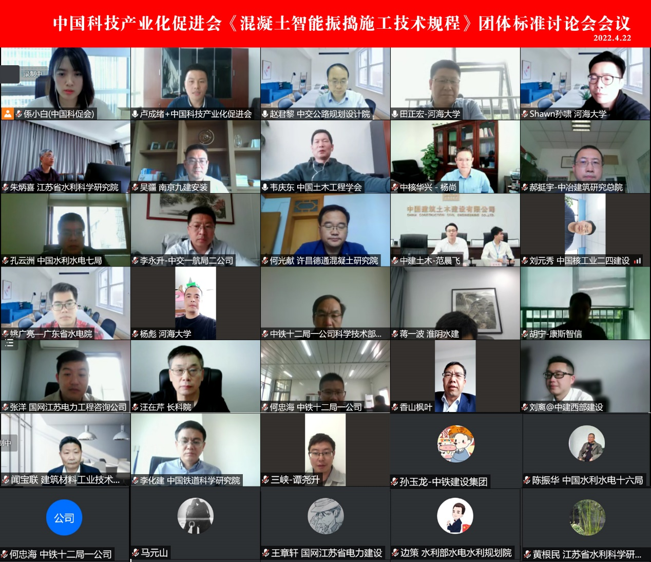 4月22日,由中国科技产业化促进会组织,成人抖音 与中国水利水电第七工程局有限公司联合起草的《混凝土智能振捣施工技术规程》团体标准(征求意见稿)专家研讨会在线召开。