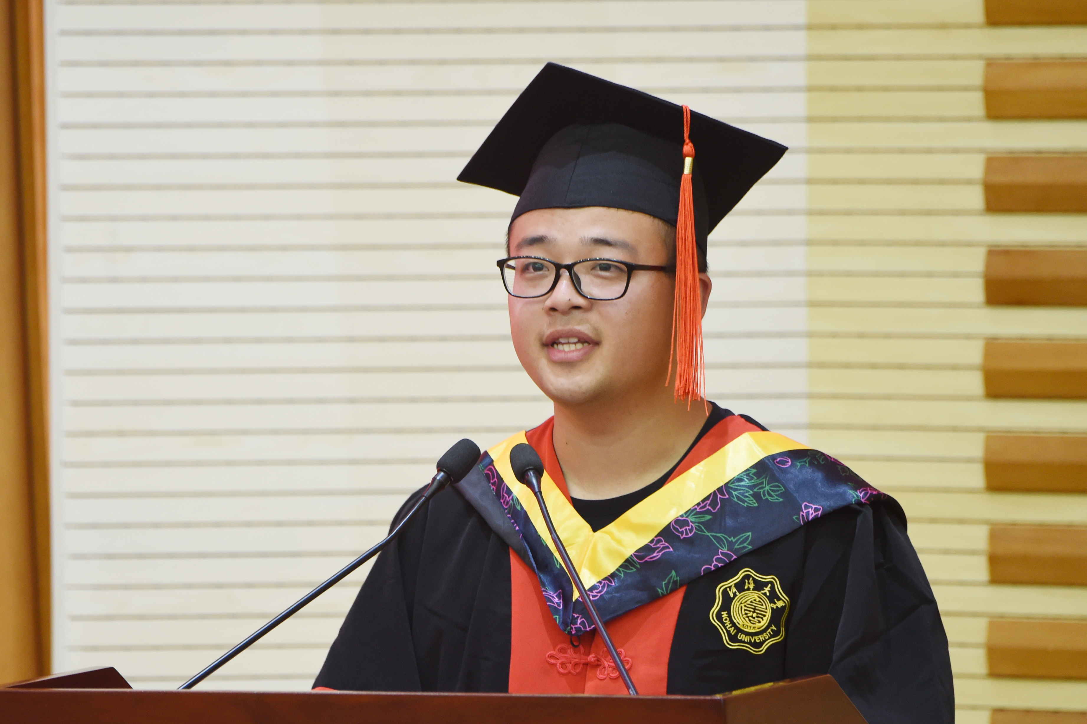 班导师代表黄显峰老师表达了对毕业生们最热烈的祝贺,勉励毕业生自觉地从“水”的精神中汲取前进的动力,努力成为知识与能力兼备、智商与情商兼备、素质与作风兼备的栋梁之材。