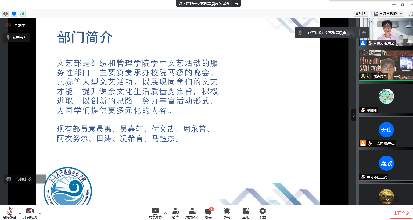 文艺部袁晨禹同学对部门工作进行了回顾和展望,文艺部的同学们热情洋溢,敢想敢做,顺利地举办了各类文艺活动,既有助于丰富同学们的精神生活,又有助于提升其文化素养。