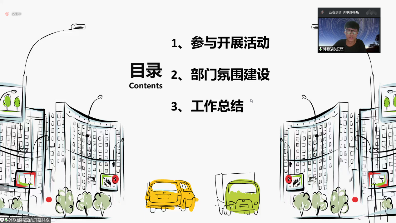 外联部杨磊同学介绍了部门举办的“新干事见面会”、“新生辩论表演赛”等活动,外联部以积极向上的工作态度,做好了各部门之间的联系桥梁,为同学们打造了各种精彩纷呈的活动。