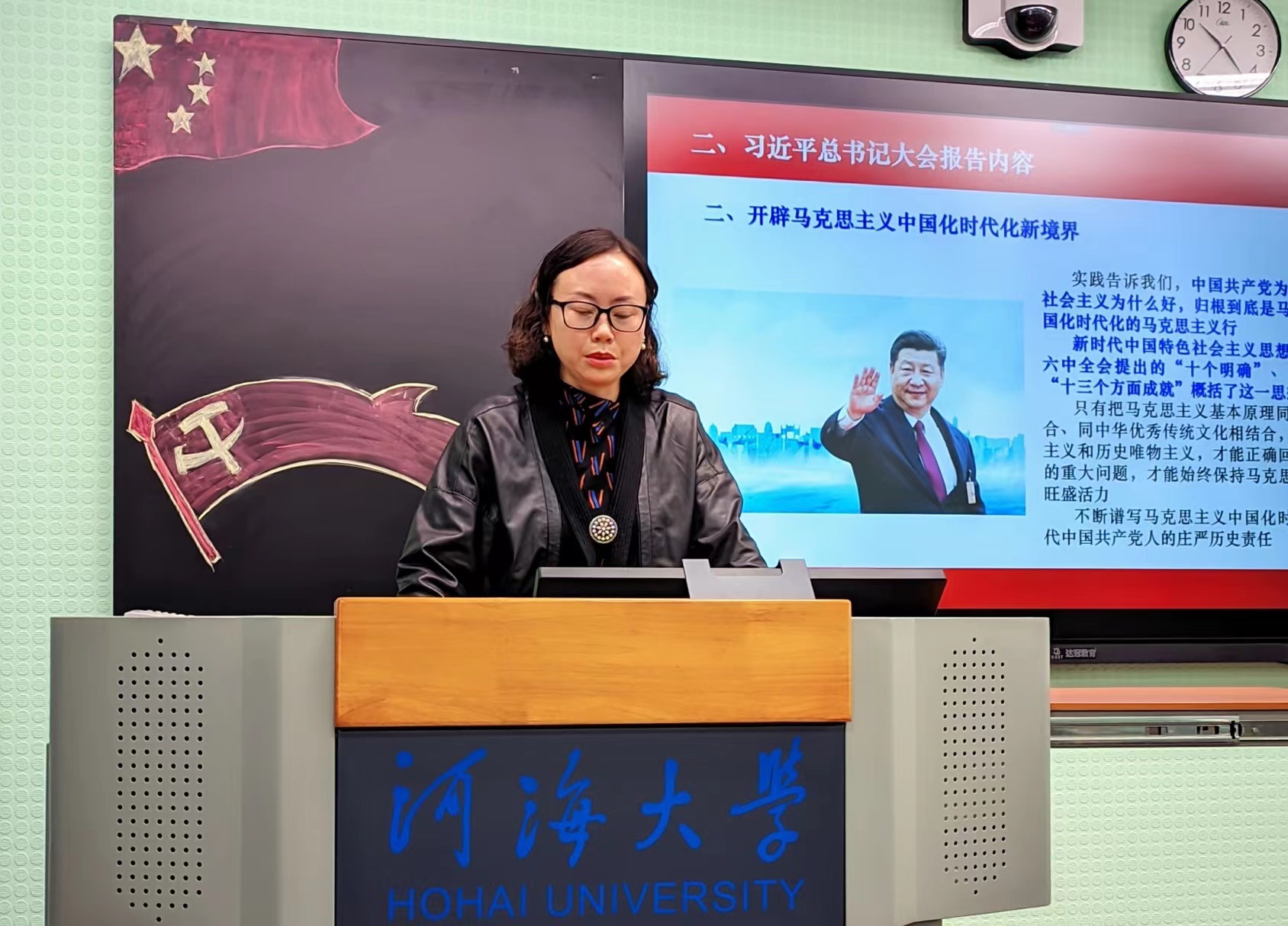 智慧所教师党支部书记高玉琴老师带领师生集体学习党的二十大报告精神。她鼓励同学们要矢志不渝、笃行不怠,在认真学习贯彻党的二十大精神中,注入不竭的前进动力,为全面建设社会主义现代化国家、全面推进中华民族伟大复兴而团结奋斗。她从研究方向、师资力量等方面介绍了智慧所的基本情况,分析了智慧水利专业前景和水利行业发展新业态。她提到,水利进入4.0时代,迫切需要综合性、智能化的智慧水利专业人才,期待同学们能够勉励学习、求实创新,为新时代水利发展贡献自己的青春力量。