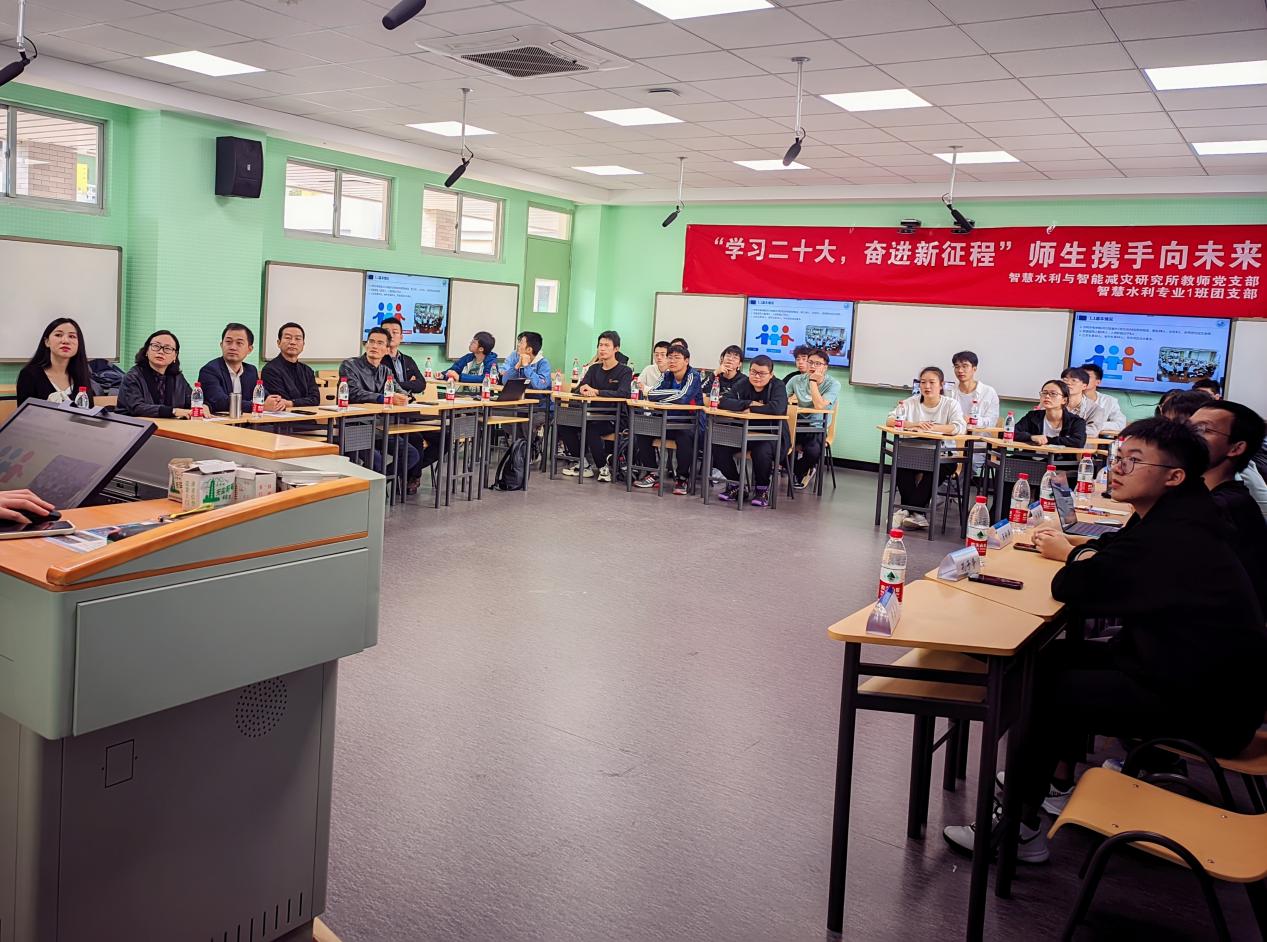 11月11日,成人抖音 智慧水利与智能减灾研究所教师党支部与2022级智慧水利专业1班团支部共同举办“学习二十大,奋进新征程”师生携手向未来活动。学院党委书记娄健、副院长王建、党委副书记王方、智慧所教师党支部书记高玉琴老师、智水一班班导师任杰老师、22级辅导员姜帆老师出席。智慧所教师党员在线上、2022级智水一班全体同学在线下参加了本次活动。活动由姜帆老师主持。