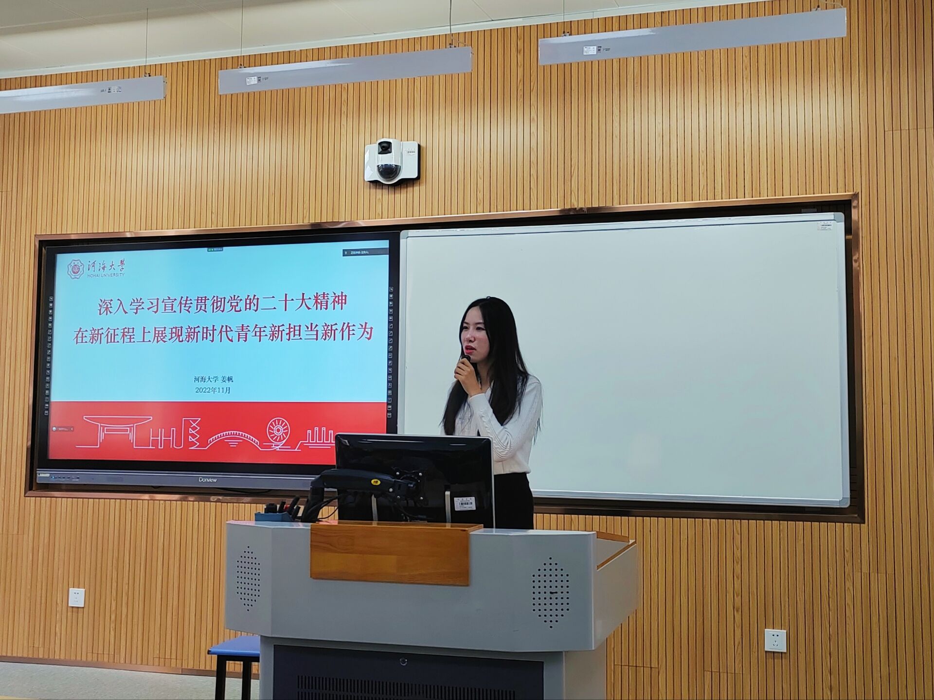 姜帆老师向大家介绍了中国共产党第二十次全国代表大会的基本情况,她就党的二十大主题的内涵做了深入阐释,从举什么旗、走什么路、坚持什么样的行动指南、传承什么样的精神法宝、以什么样的精神状态、朝着什么样的目标前进等几个问题出发,解读了二十大主题的精神内涵和深邃意蕴。她以从十八大以来成人抖音 在中国水利中做出的贡献为例,强调了高举中国特色社会主义伟大旗帜的重要意义。她从新时代10年的伟大变革出发,阐明了中国特色社会主义道路的重要性与必要性,强调了河海作为“红帽子大学”,始终坚守着爱国爱水的家国本色,矢志不渝的培养拥有家国情怀、河海特色的新时代水利人。