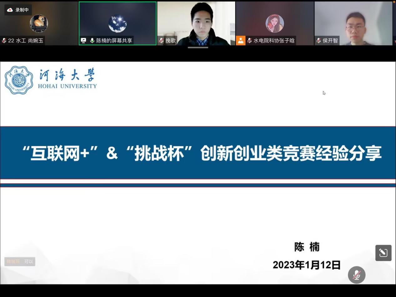 为更好地帮助同学们积极参加“挑战杯”“互联网+”等创新创业赛事,营造浓郁的科创学术氛围,2023年1月12日,我院举办“如何从大创项目提炼挑战杯、互联网+创新赛事经验”专题分享会。院研究生辅导员赵志涵、陈辰,本科生辅导员姜帆、笪步源、侯开智、梁培德参加此次会议。会议主讲人为水电院21级研究生陈楠,港航院19级本科生李昊,会议由学生科协干事吕一凡主持。
