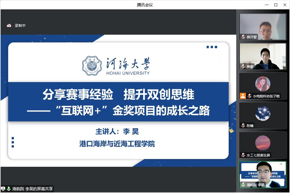 曾获第八届中国国际“互联网+”大学生创新创业大赛金奖的《探伤专家——水利工程智能缺陷检测设备领航者》项目核心成员李昊,他从个人的项目历程娓娓道来,深入解读“小挑”、“大挑”及“互联网+”大学生创新创业三项赛事;从赛事要求、评审规则、选题方向、团队组建、赛程安排、具体细节等多角度详细介绍参赛注意事项,列举案例、真情实感详细剖析商业计划书、项目PPT制作经验。他指出项目选题应立足河海大学水利学科优势,并向“互联网+”热门方向发展,以此让大家对于各类赛事能更好地有的放矢。