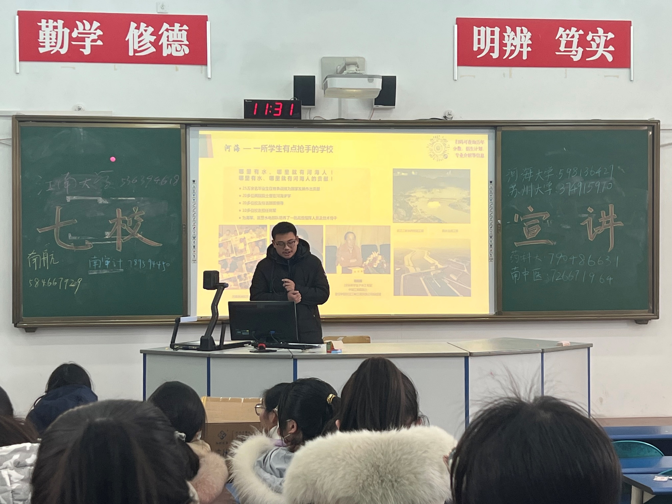 在江苏省盐城中学,实践团与其他回江苏省盐城中学宣传的高校队伍联系,共同举办“高校节”活动,得到高中母校学生及家长的广泛关注。很多学生拿到宣传物资,聆听河海故事,了解河海文化。同时,在宣讲过程中,不少家长和同学针对自身目前情况向实践团队成员提出自己的疑虑,实践团成员还在“专业选择”、“职业规划”、“发展方向”、“就业前景”等方面给他们在未来报考学校和专业方面提出建议,解答困惑。宣讲活动得到了学生家长和校方的双重肯定,实践团成员也在活动中得到锻炼提升。