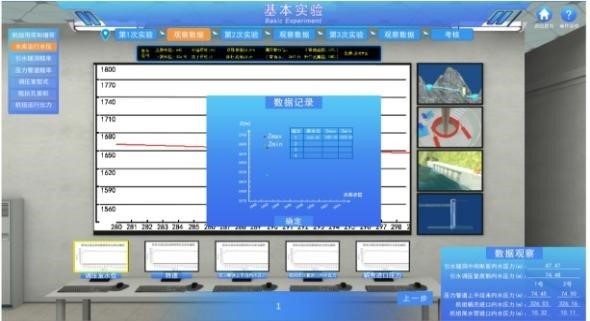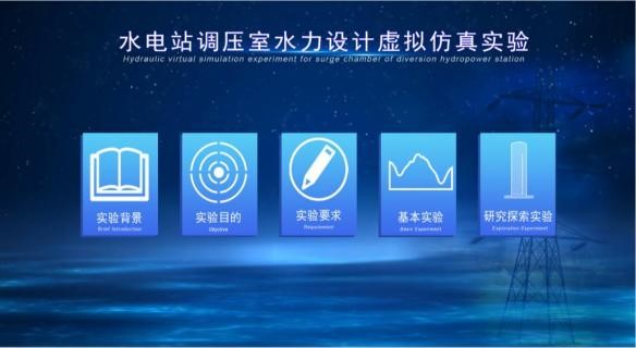“水电站调压室水力设计虚拟仿真实验”课程通过实验设计凸显水利水电行业和学科发展的前沿问题,突破水电站引水发电系统原型实验和环境条件的限制,基于虚拟现实技术营造栩栩如生的仿真场景,实现身临其境般的参观学习和真实般的操作体验;实验融合数值计算和3D仿真,设计理论学习、实验认知、基本实验、研究探索实验和实验报告共5个模块15个交互步骤,并辅以实时数据、统计表格、动态曲线和虚拟表计,实现可视化的调压室水力设计基本实验和研究探索实验,涵盖高危和不可逆的调压室运行报警工况,场景逼真、技术先进。