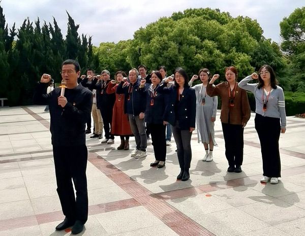 跟随着讲解员的脚步,在中心广场照壁前,全体党员学习了《沙家浜的意义》微党课。在瞻仰广场中央屹立着以“郭建光”、“阿庆嫂” 等形象为主创作的大型主雕,演绎深化鱼水情深主题,也淋漓尽致地表现出了新四军伤病员泰山压顶不弯腰的革命精神。怀着对革命烈士崇高的敬意,全体党员整齐排列,向革命先驱进行三鞠躬,党员代表敬献花篮,娄健书记带领大家重温入党誓词。