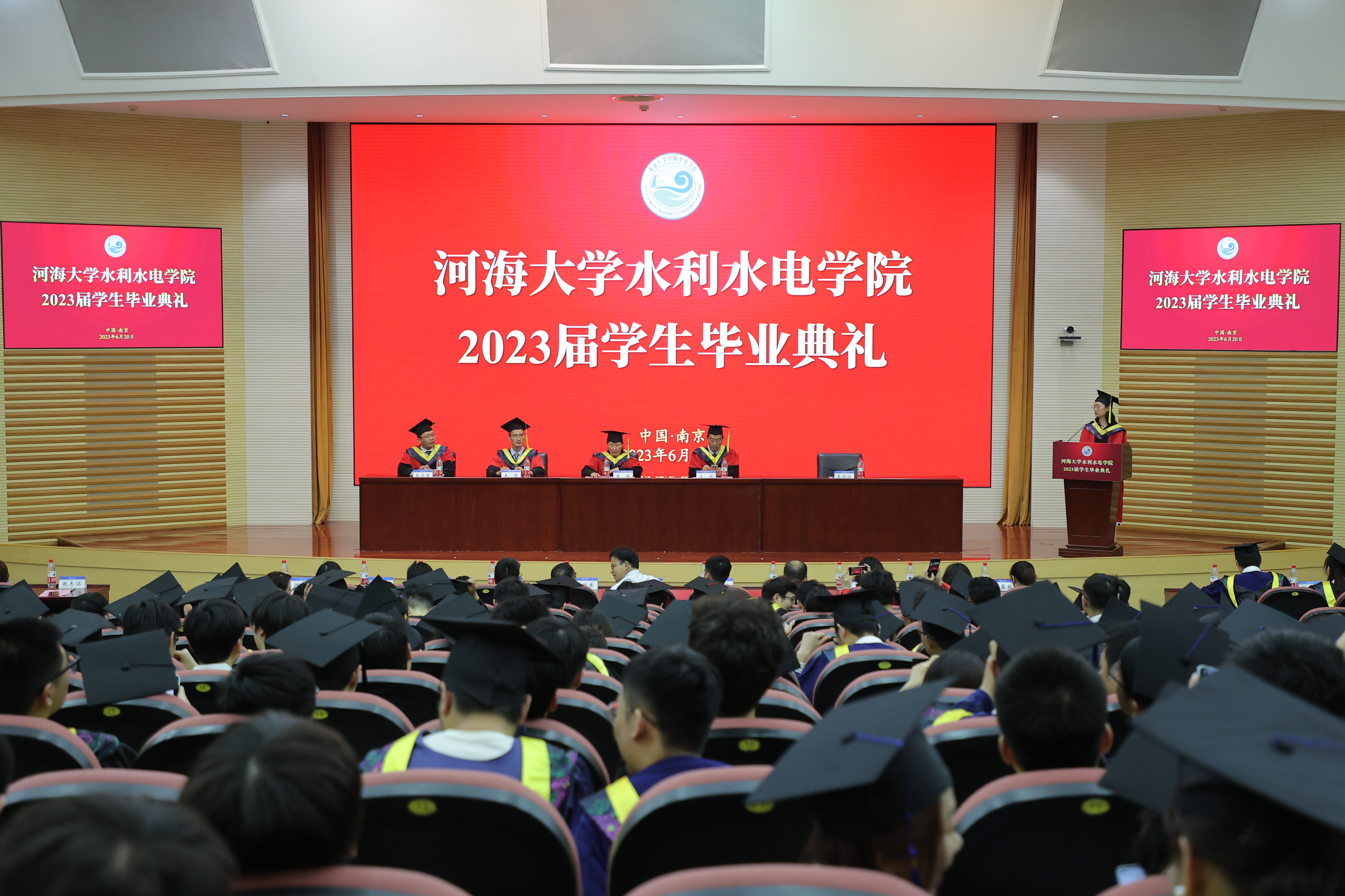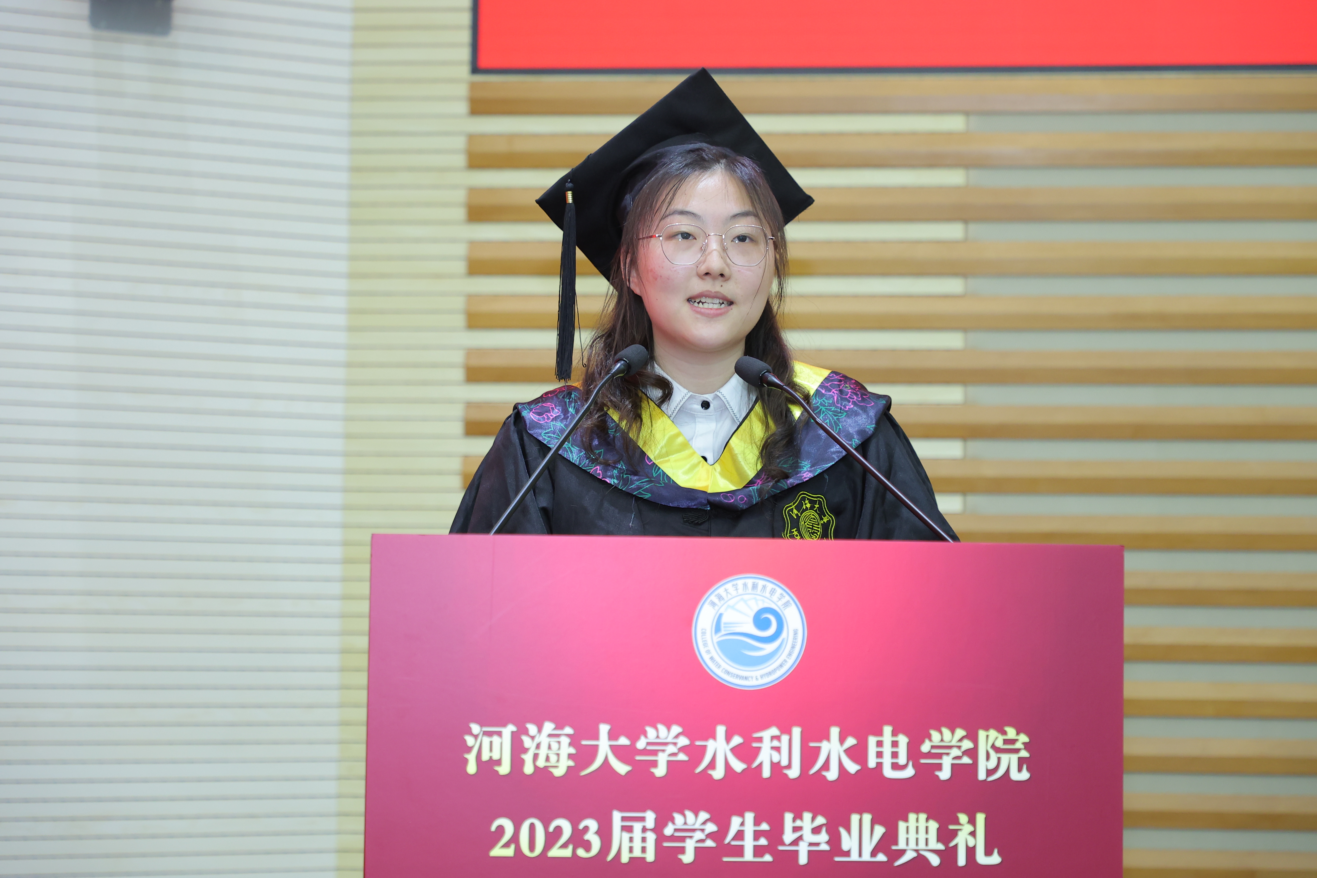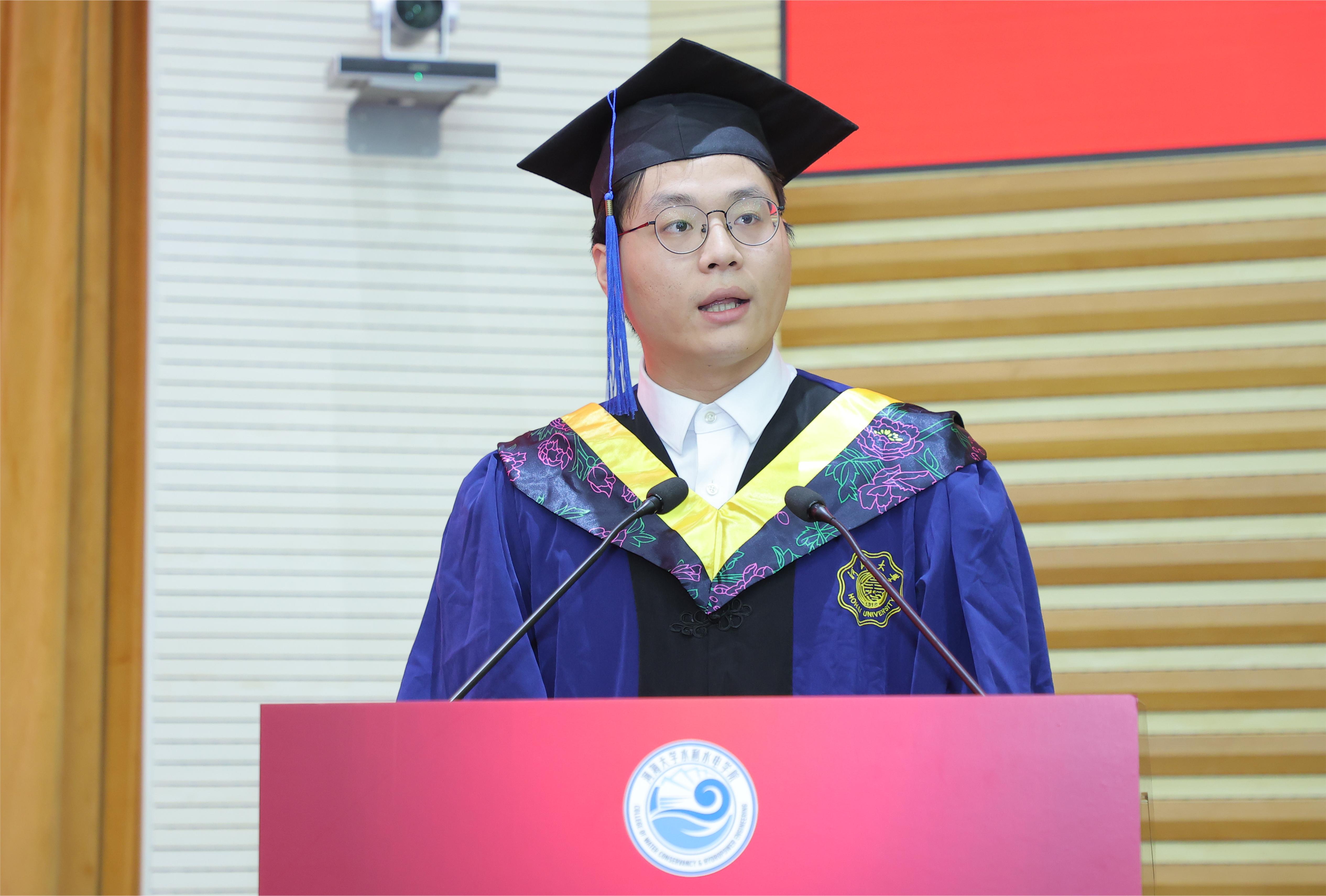 研究生毕业生代表黄啸宇、本科毕业生代表张亚琳发言,表达对于学院深厚的感恩之情,展现了水电青年的志气与勇气。
