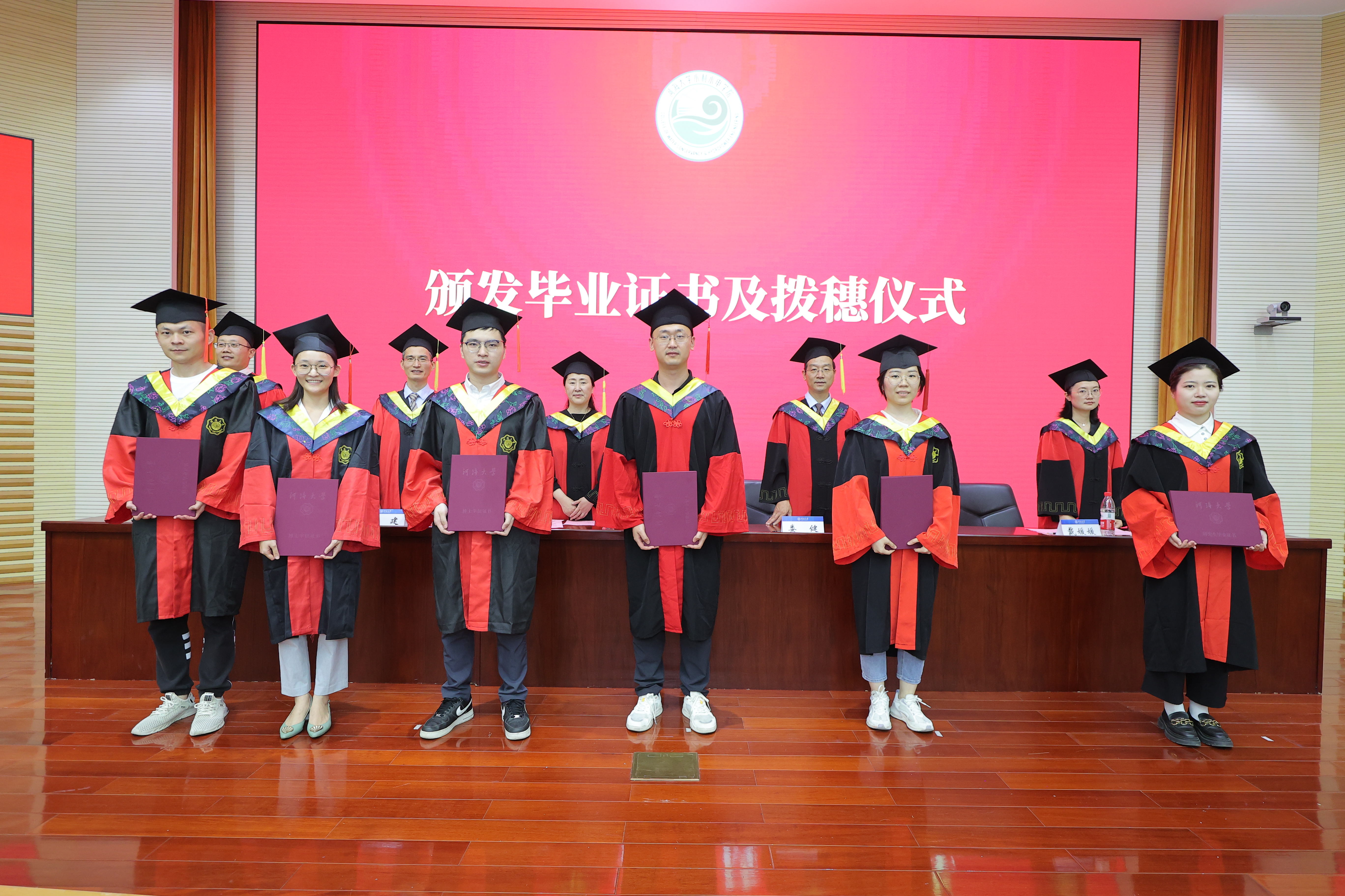 学院领导为全体毕业生颁发毕业证书,扶正流苏,并赠送毕业纪念品。