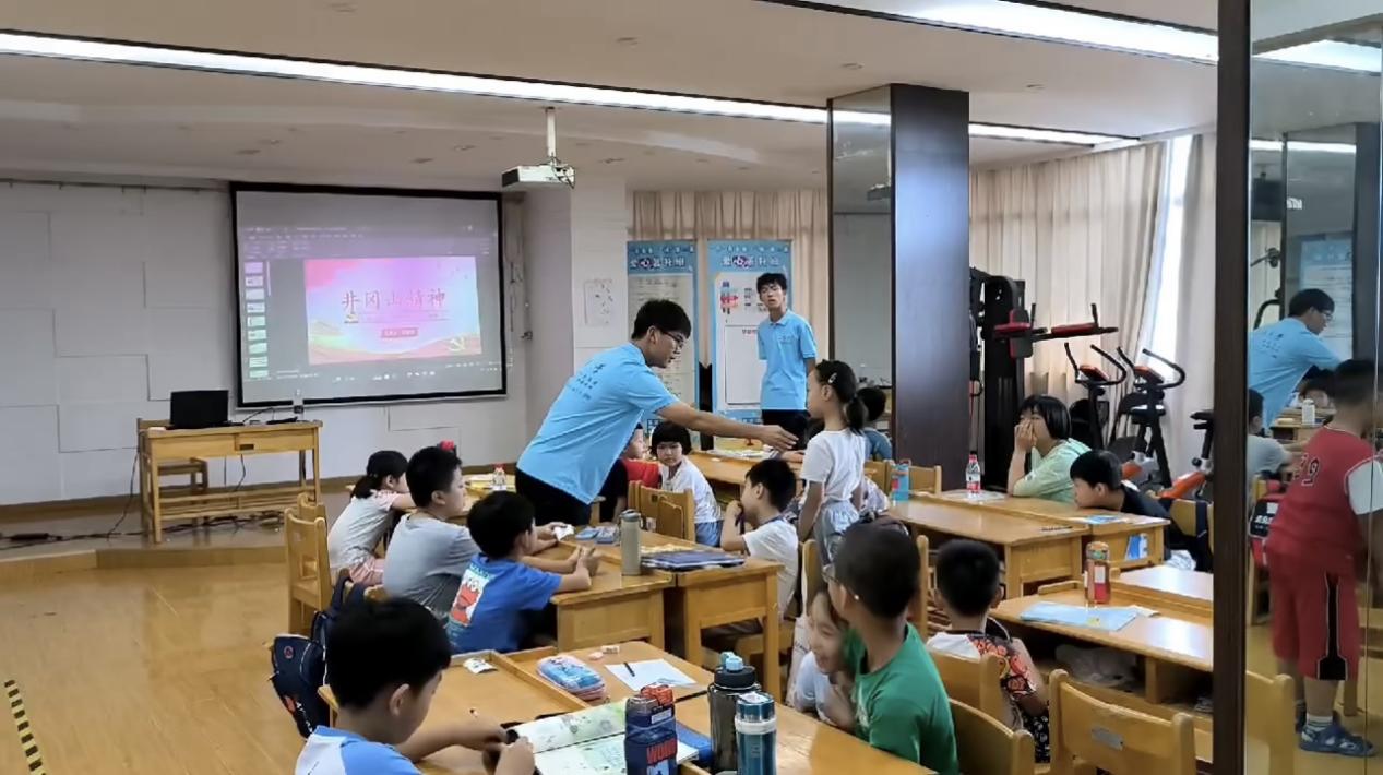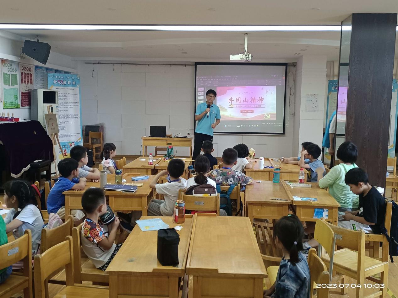 实践团成员结合丰富的PPT,以翔实的历史资料、丰富的历史图片介绍了红军在井冈山的发展历程,通过叙述井冈山时期的人和事,引出井冈山精神及其丰富内涵,最后引导小朋友牢记“坚定信念、艰苦奋斗、实事求是、敢闯新路、依靠群众、勇于胜利”的井冈山精神。宣讲过程中,小朋友们认真聆听、积极思考,展现出对井冈山历史的好奇、对学习井冈山精神的热情。