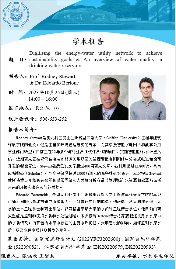 学术报告会 | 数字化能源-水公用事业网络以实现可持续发展目标&饮用水水库水质概述