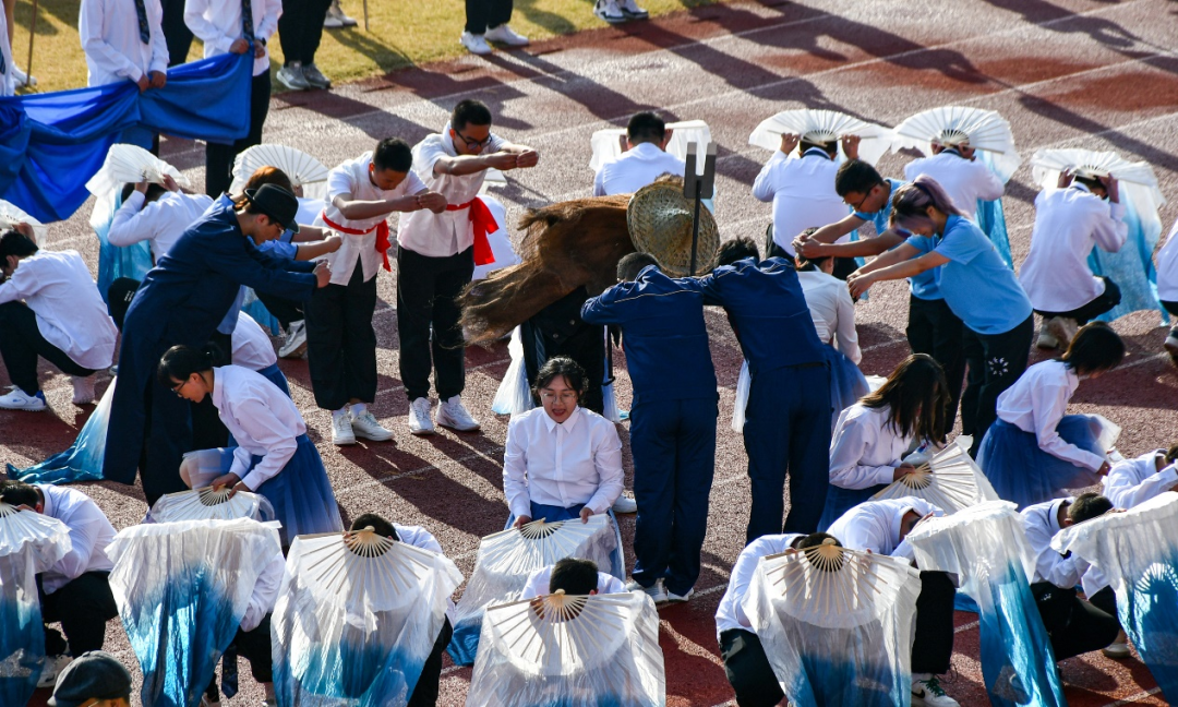 表演开始时,为模拟大禹治水的场景,同学们挥舞着象征波涛的折扇,配合中心治水者的表演,展现出人民治理水患的决心和智慧。这个环节不仅展现了水电学子对古代水利工程的尊重和继承,也表达了水电院始终不忘初心。随后,方阵切换到了现代社会的水利水电工程建设场景。同学们穿着不同服饰,象征不同职业者对于水利工程的重视。整齐的步伐,响亮的口号,展现出水电学子们无私奉献、勇于挑战的精神,无论身处什么行业,都愿成为推动水利水电事业发展的中坚力量。