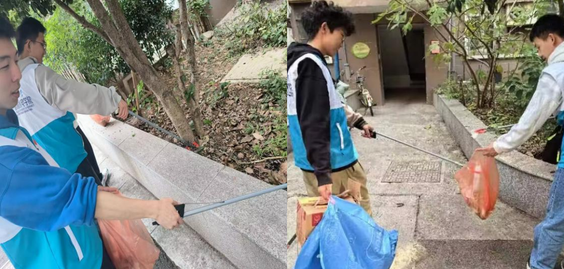 另一部分同学拿着环卫长柄和垃圾袋穿梭在社区中,在一次次弯腰中将垃圾清扫掉,为社区卫生贡献出一份力。