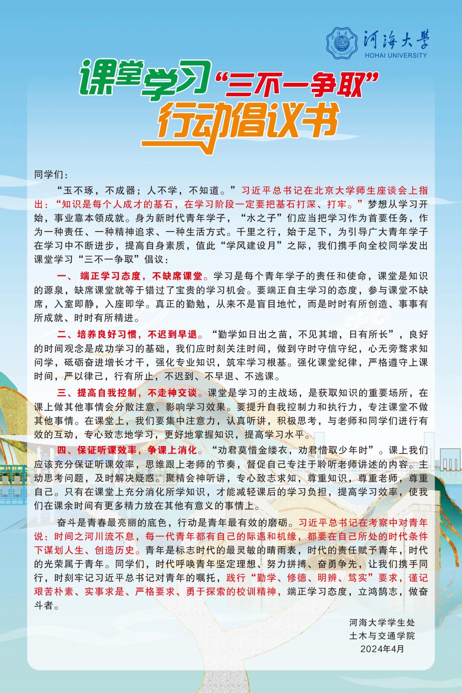 为进一步加强学风建设,营造良好的育人环境,成人抖音 根据学风建设月总体要求,认真贯彻“三不一争取”行动倡议有关内容,在思想上引领同学们充分发挥课堂作用,培养学生学习主观能动性和认真的学习态度,自发承诺并真正做到“在课堂上培养良好的自控能力,不缺席、不迟到早退、专注课堂,不做与课程无关的事情,争取最大限度把握课堂效率,在课堂中消化更多课程内容”。