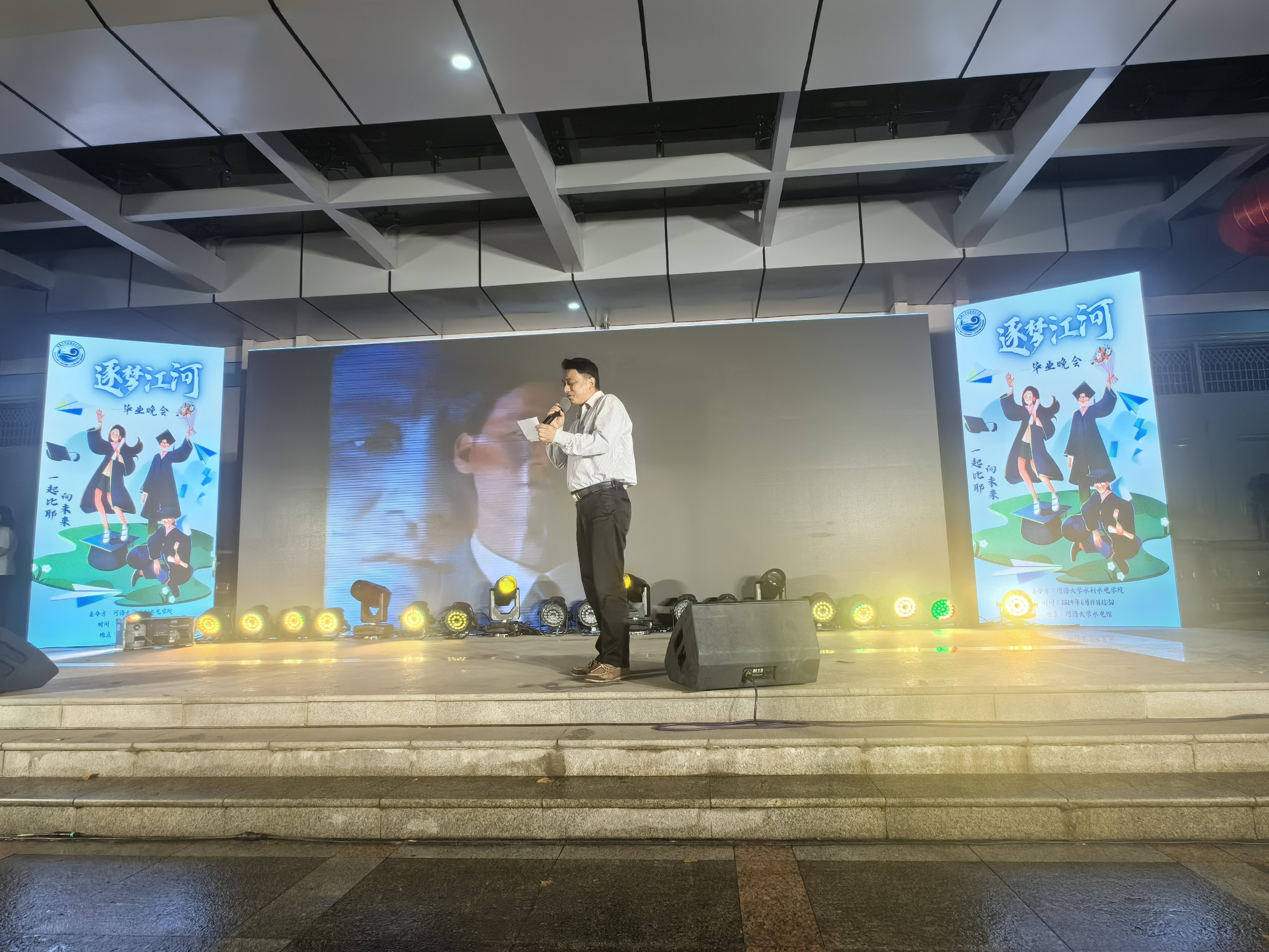娄健书记代表学院向2024届水电院全体毕业生表示热烈的祝贺和美好的祝愿。娄书记称赞此次活动的组织策划与精心准备,展现出水电人不惧风雨、坚韧不拔、逐梦江河的意志品质,希望同学们在今后的人生路上也要敢于有梦、勇于追梦、勤于圆梦,实现自我价值。他期待同学们在不久的将来能再次相聚在河海校园,水电院是大家永远的港湾。