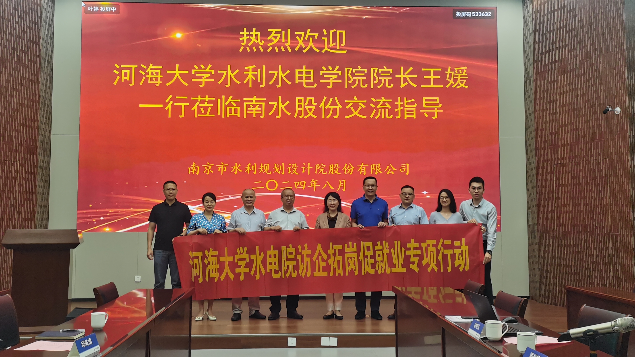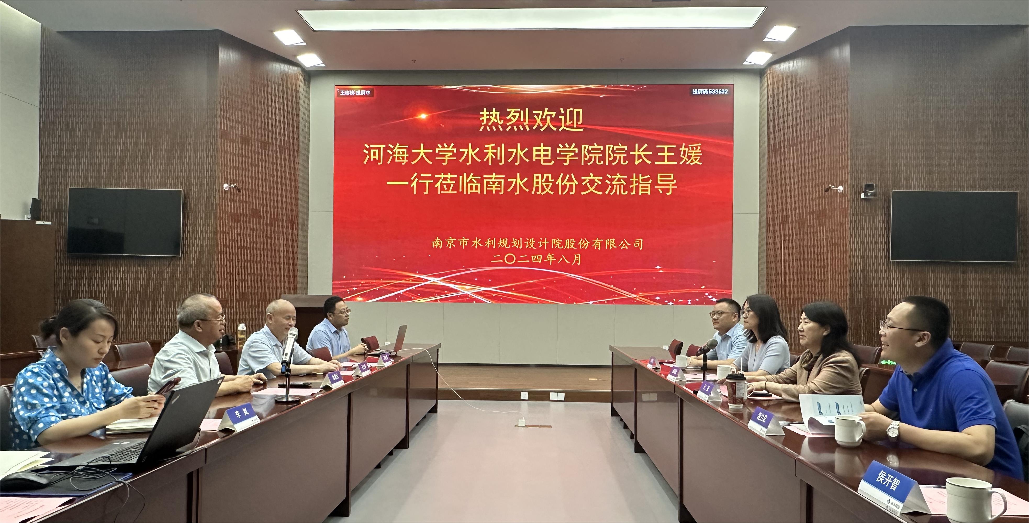 8月16日,学院院长王媛带队赴南京市水利规划设计院股份有限公司(下文简称“南水股份”)开展访企拓岗交流活动。学院副院长赵兰浩、副院长俞晓东、党委副书记戴媛媛、辅导员侯开智共同参加活动。南水股份董事长徐惠民、监事会主席张子龙、水利分院副总邱乾勇、人力资源部主任李岚、智慧水务分院王彬彬及相关部门负责人出席活动。