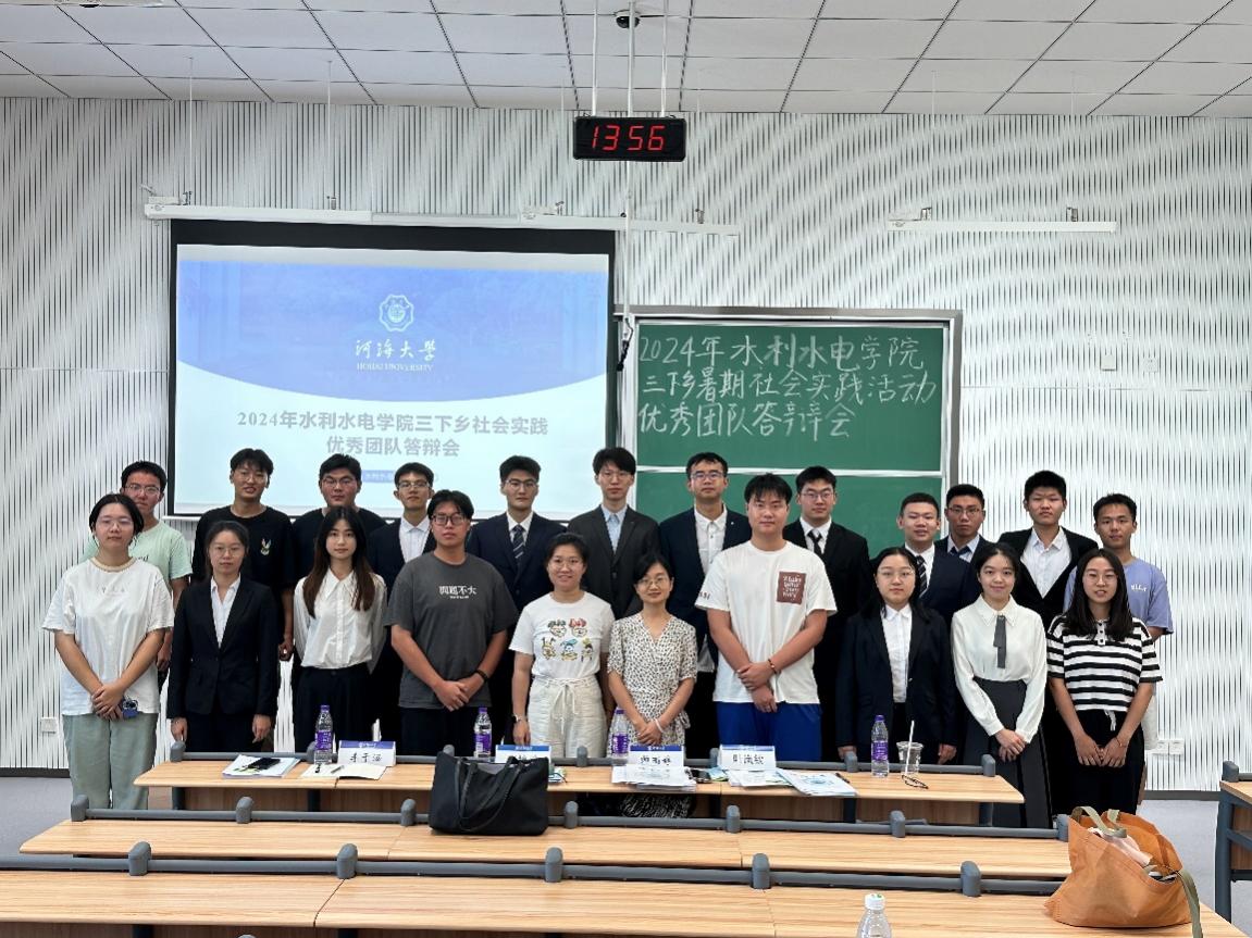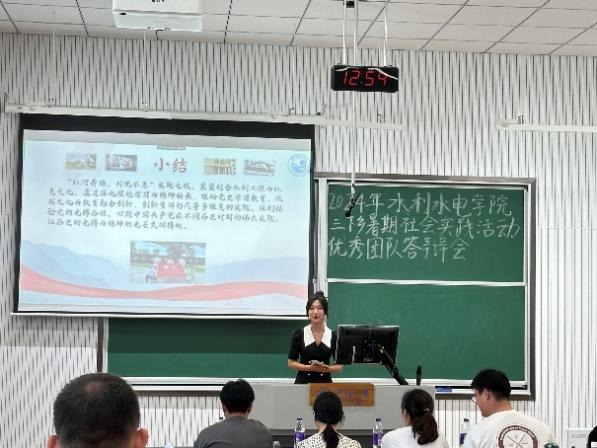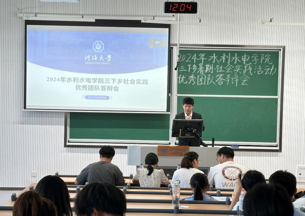 答辩会上,17支评优团队的代表依次上台,就暑期社会实践项目进行了精彩的展示,通过PPT、视频等多种形式生动详实地汇报了在暑期社会实践中的工作内容、实施过程、所取得的成果以及遇到的挑战和解决方案。这些实践项目涵盖了发展成就观察、乡村振兴、红色文化传承等多个方面,从调研水网建设现状到探寻新能源的绿色转型之路,从走进千乡万村进行科普宣传到保护红色水利遗产,充分展现了河海学子将专业知识与社会实践相结合的能力。