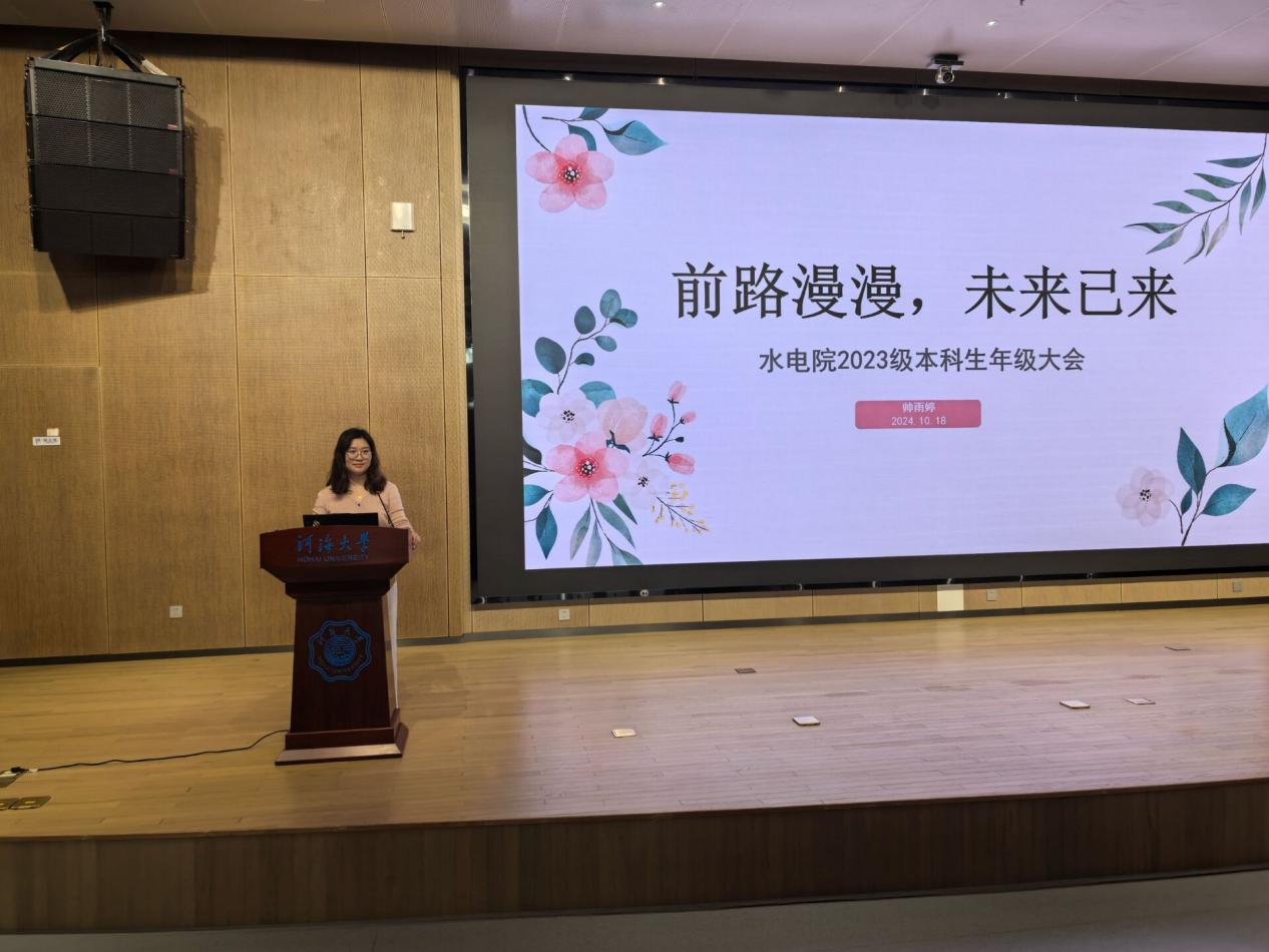 2024年10月18日,成人抖音 2023级本科生召开“前路漫漫,未来已来”年级大会。会议由2023级本科生辅导员帅雨婷主持,2023级本科生全体参加。