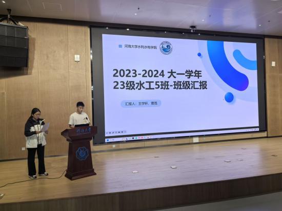 2023级水工六班班长赵一凡、团支书李卓烨围绕“水工六班23年度班长团支书述职”主题进行汇报。他们以坚定的领导力和出色的沟通能力,成功团结班级成员,创造了良好的学习氛围。