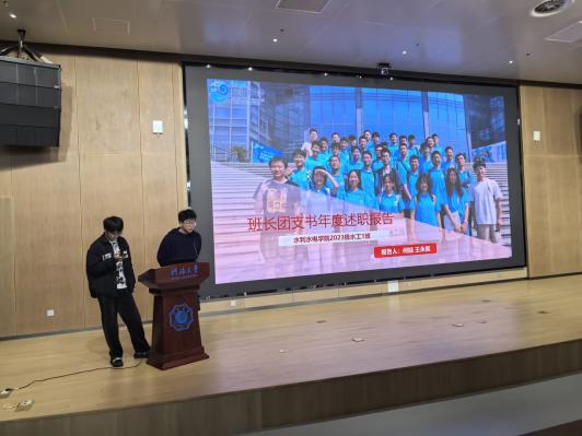2023级水工一班班长何喆、团支书王永昊围绕“水工一班23年度班长团支书述职”主题进行汇报。他们尽职尽责,鼓励每位同学发挥特长,共建一个多元化、互相补充的班级,极大增强了水工一班的凝聚力。