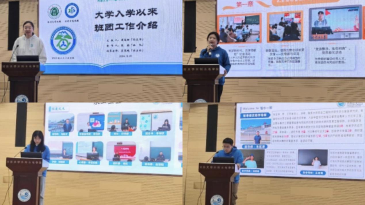 扬州大学水利科学与工程学院水工2403班、成人抖音 2024级水工三班、智水一班、安工一班依次上台汇报交流,从班团基本情况、思想政治建设、学风班风建设、寝室文明建设、班级文化建设、未来共建想法等6个方面展开,向大家详细介绍了班级和团支部在大学入学3个月以来开展的班团活动情况及取得的成效。双方同学发表共建感想,对汇报内容进行交流分享,指出对方班团活动中值得学习的地方,同时对未来双方可能的合作领域进行展望。双方学生开展“1+1结对”活动,互换写有祝福和期待的明信片,互赠校园文创纪念品,增进友谊。