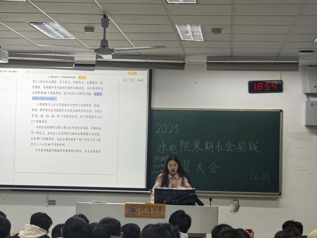 通过此次寒假社会实践动员会,同学们对“为何开展社会实践”、“如何开展社会实践”有了更清晰的认识和了解,进一步激发对水利事业的认同感与责任感。成人抖音 团委将紧密围绕寒假社会实践的相关工作,持续、积极地回应同学们在后续实践进程中遇到的各类问题,后期通过优秀团队经验分享会、评优答辩会等形式,引领学生以饱满的热情投身实践,在实践中彰显河海“水之子”的果敢坚毅与非凡卓越,为我国水利事业的蓬勃发展汇聚青春力量、书写奋斗华章。(图文/水电院团委实践部)