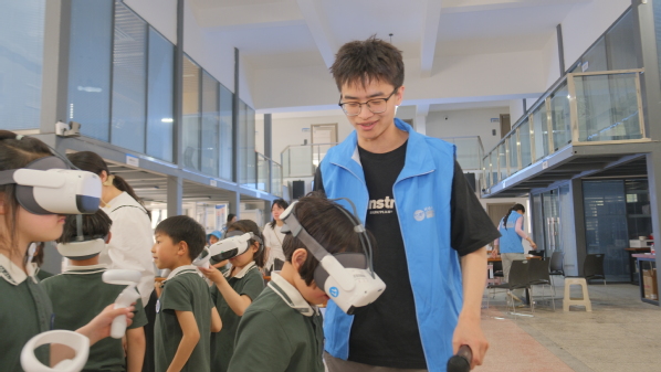 随后,在志愿者的引导下,小朋友们戴上VR设备,借助虚拟仿真技术“亲临”三峡大坝建设现场,以360度全景视角沉浸式体验巨型水利工程的壮丽与宏伟,近距离观察水轮机运转,感受“截断巫山云雨”的震撼壮举。