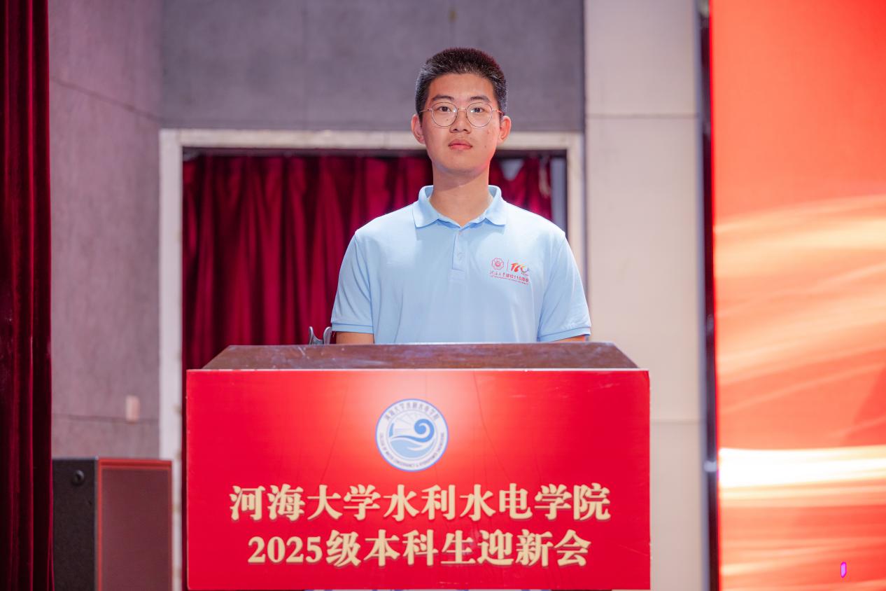 新生代表2025级水利水电工程专业李彦德同学代表全体新生发言,讲述了自己选择河海的历程,围绕大学规划,表达了对未来校园生活的展望。作为建校110周年之际的新生,他表示将与师生共同努力,为成人抖音 再谱新章。