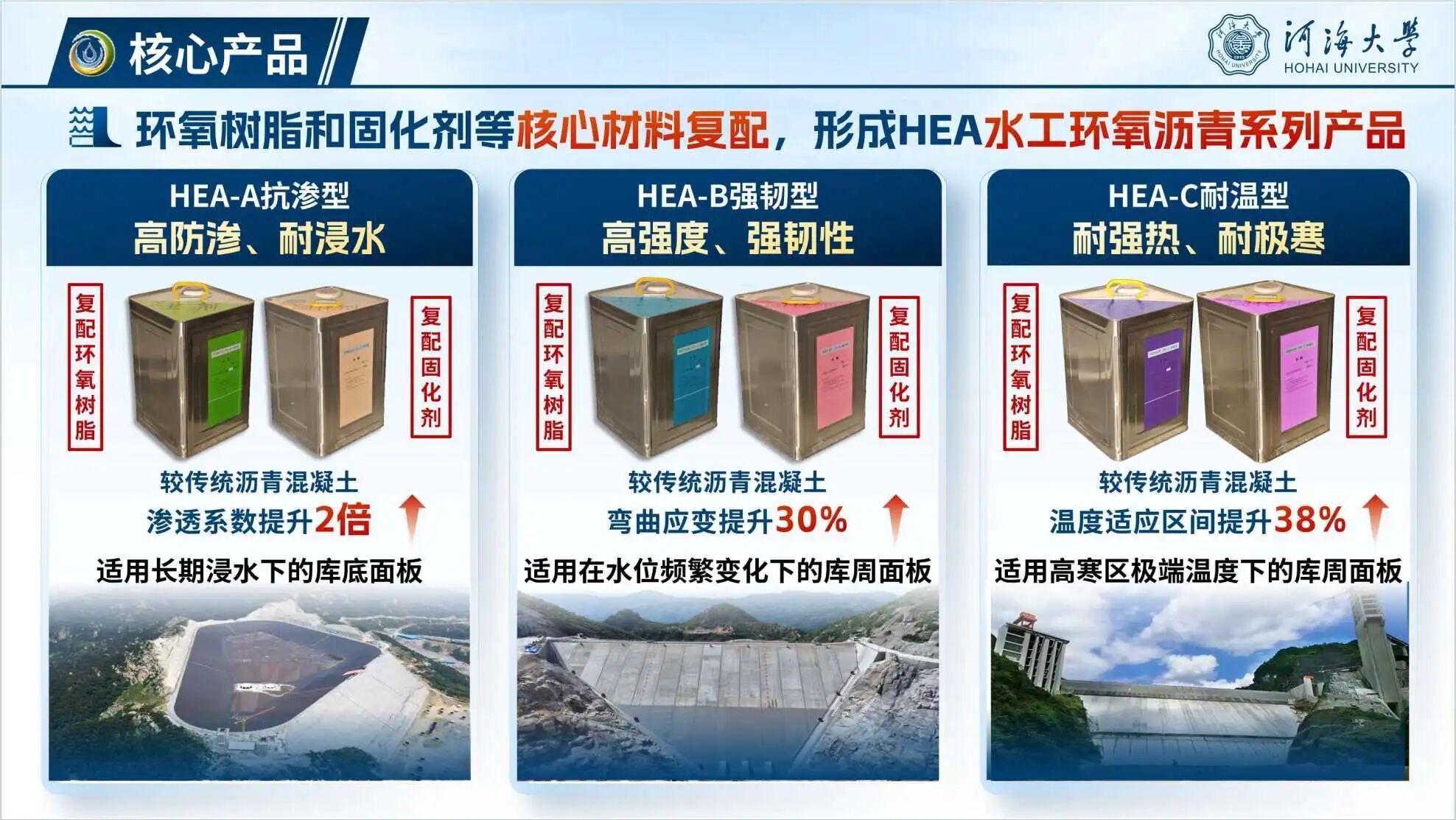 项目首创提出“水工环氧沥青定向研发+智能化配比系统”解决方案。针对沥青混凝土在服役过程中痛点问题,研发核心产品,配套智慧化材料配比系统。产品已应用于多座抽水蓄能电站,与多家公司签订合作协议。